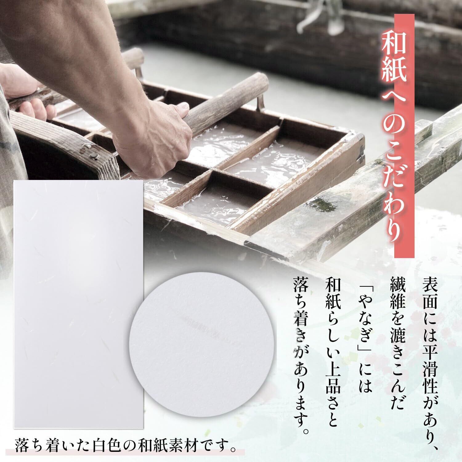 【こだわり和紙】 やわらかな白の和紙を厳選。光をやさしく受け止める風合いが、手にした瞬間に上質さを伝えます。
