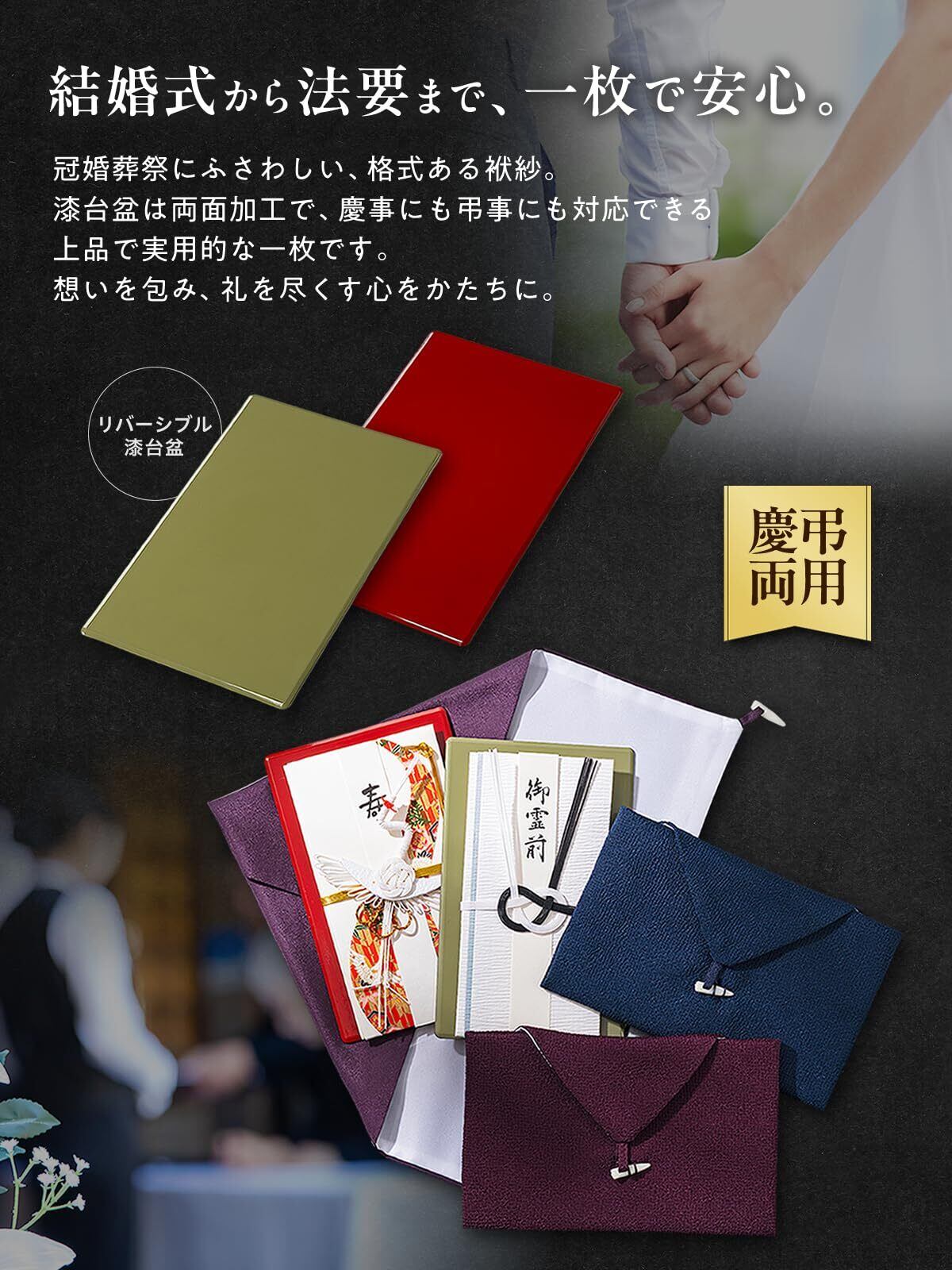 慶弔両用 – どんな場面でも美しく 結婚式などお祝いごと、お葬式などお悔みごと、幅広いシーンに対応 紫や紺色は、弔事でも慶事でも違和感なく使用可能です。漆盆も裏表で使い分け可能です。 1つ持っておけば、どんな場面でも慌てずに対応できます