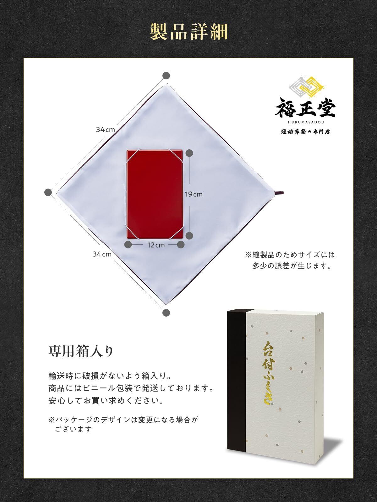 (サイズ) 布、約34㎝×34㎝ 台、約19㎝×12㎝ ※縫製品のためサイズには多少の誤差が生じます。 結婚式袱紗や香典ふくさとして利用可能。格式高いふくさとして好評です。 ① 正絹ちりめん 紫 しぼの美しい正絹ちりめんを贅沢に使用。繊細なしぼと光沢、ほどよい張りがある最高級仕立て。 (素材)正絹100% (色)紫 ※裏面はポリエステル ② 正絹ちりめん 紺 深みのある紺色と、正絹ちりめん特有の風合い。品格と上質感を兼ね備えた一枚。 (素材)正絹100% (色)紺 ※裏面はポリエステル ③ 正絹 紫 なめらかな正絹生地を使用。柔らかな手触りと自然な落ち感が特長の上質ふくさ。 (素材)正絹100% (色)紫 ※裏面はポリエステル ④ ちりめん 紫 ちりめん調のポリエステル生地。軽く扱いやすく、しぼ感のある和風の風合いが魅力。 (素材)ポリエステル(ちりめん) (色)紫