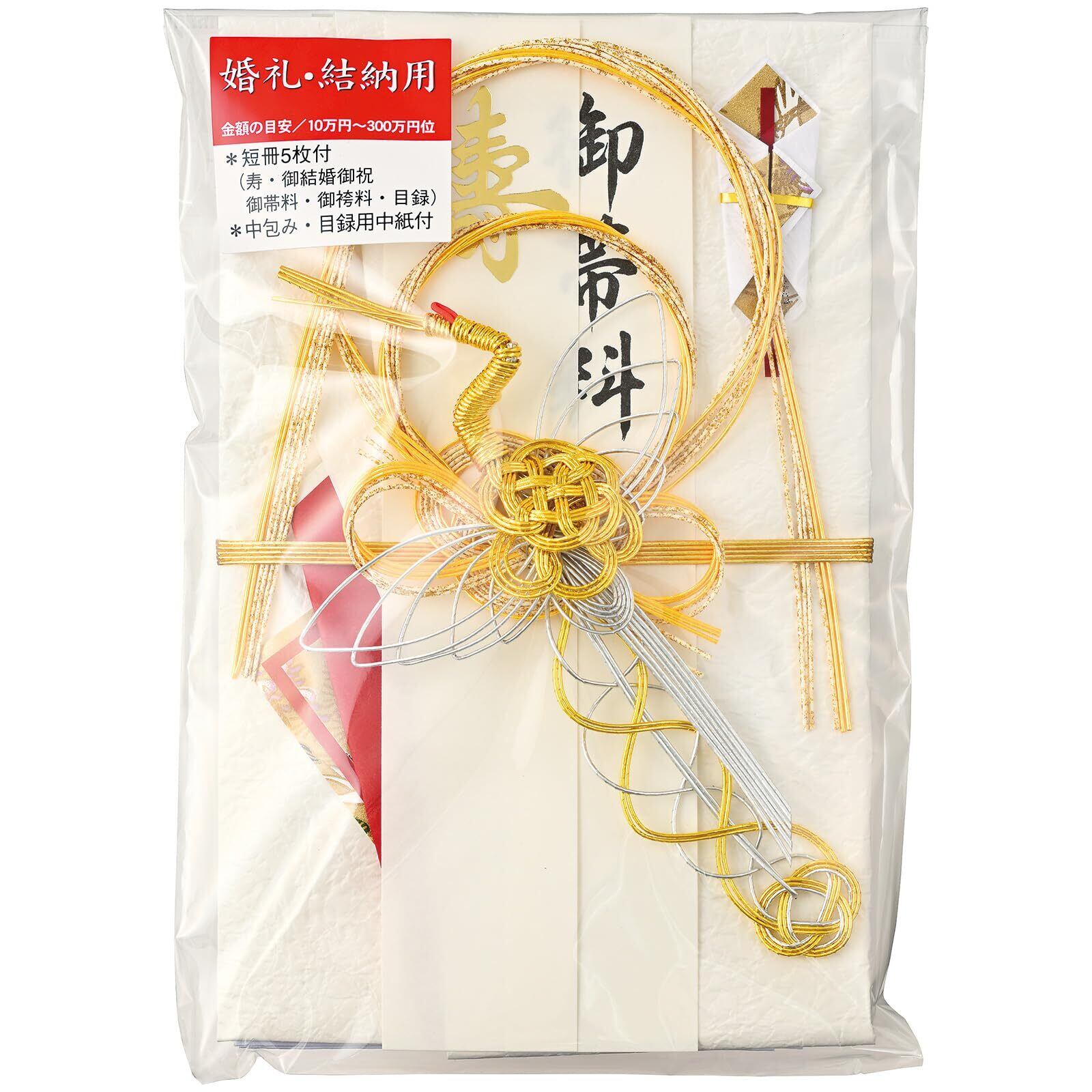 「寿」、「御結婚御祝」、「御帯料」、「御袴料」、「目録」の短冊5枚入。中包(多当タイプ)、目録用中紙付。1枚入。