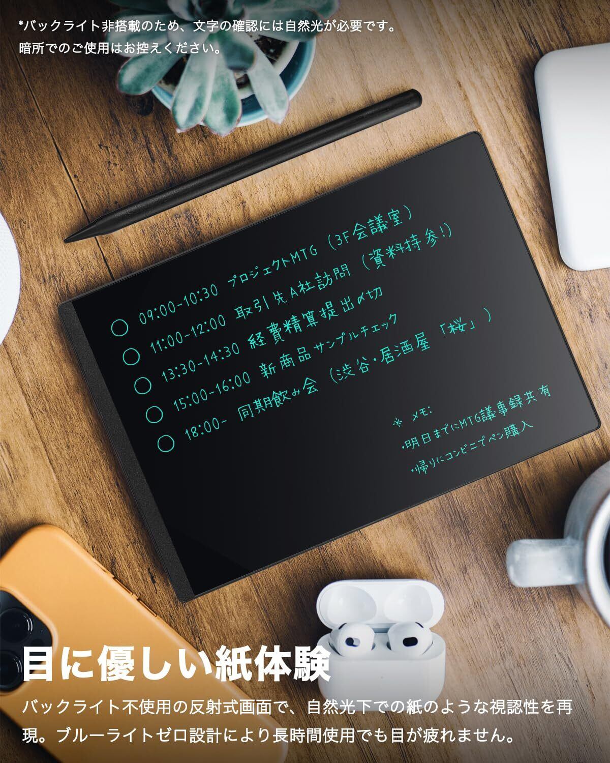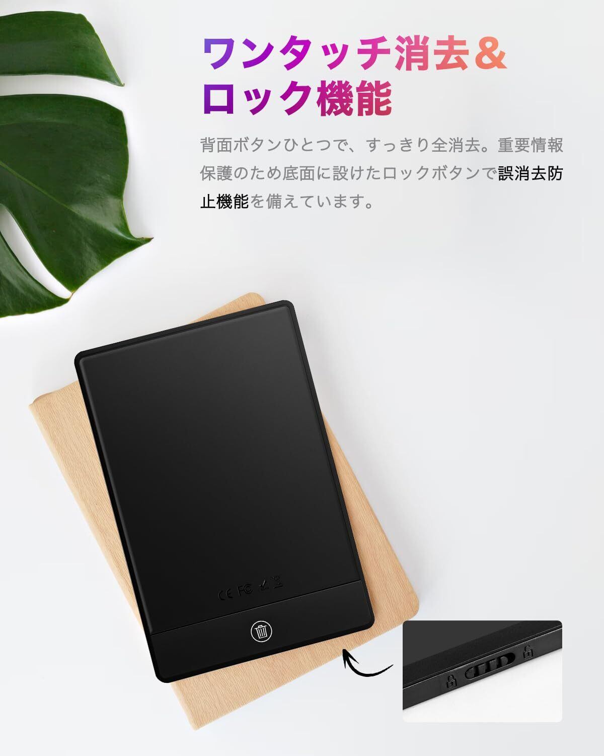 【消去ロック機能&マグネット式ペン収納】重要なメモは「消去ロック機能」で誤消去を防止。大切な情報をしっかり保護し、安心して長くご利用いただけます。付属ペンは本体右側にマグネット吸着でき、収納・携帯に便利。