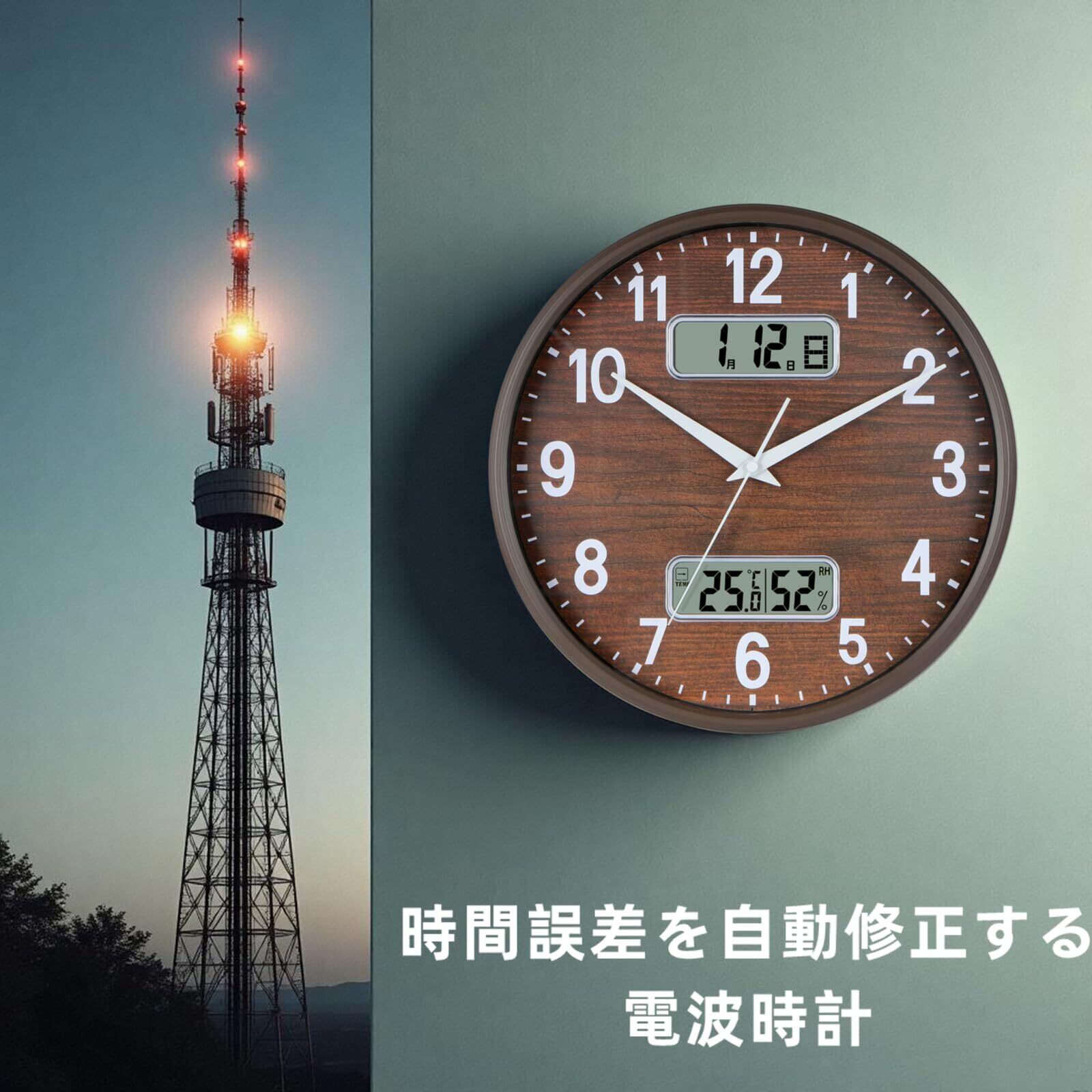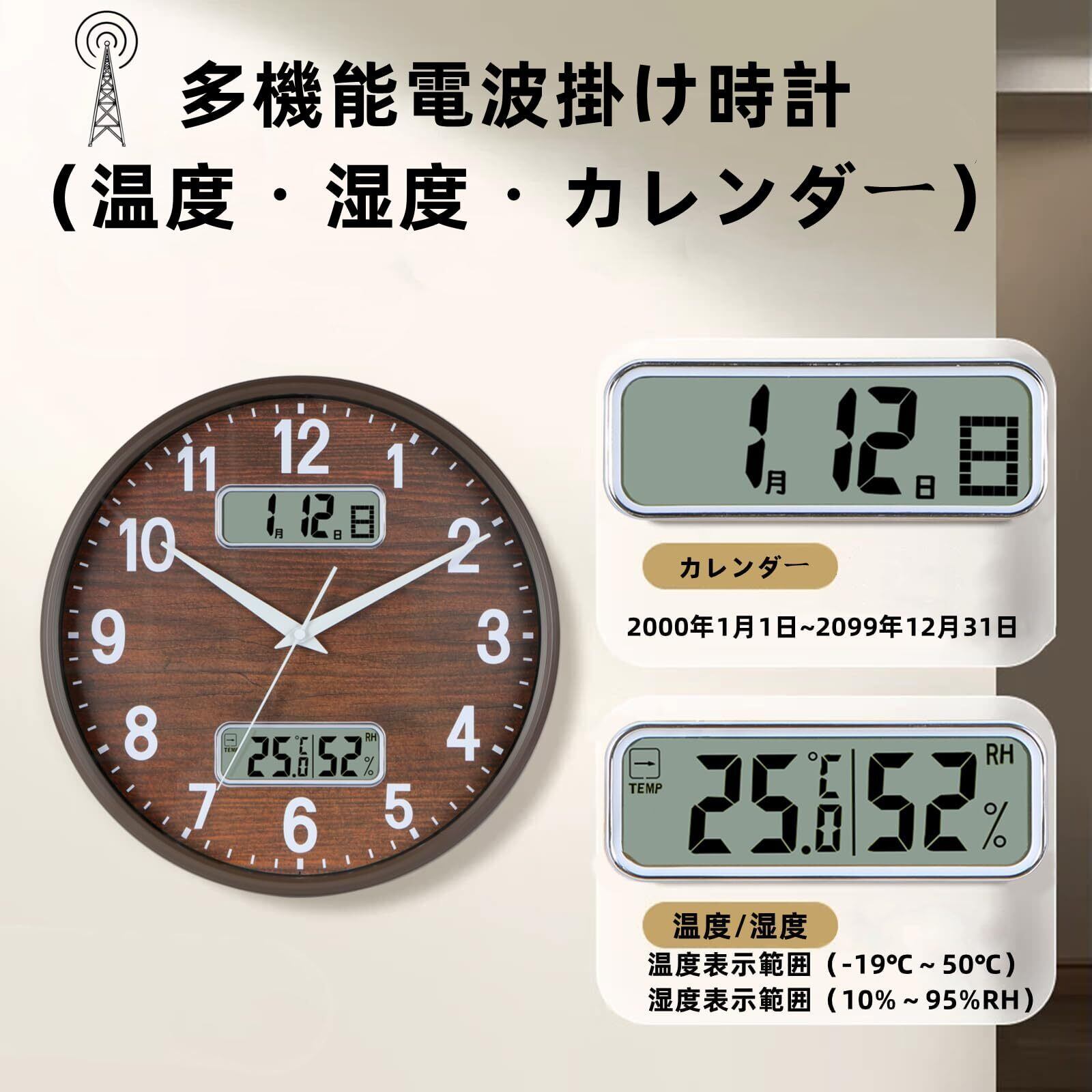 電波時計 直径32cm 挂け時計 アナログ カレンダー付き 温度・湿度表示 静音 連続秒針 コーヒー色