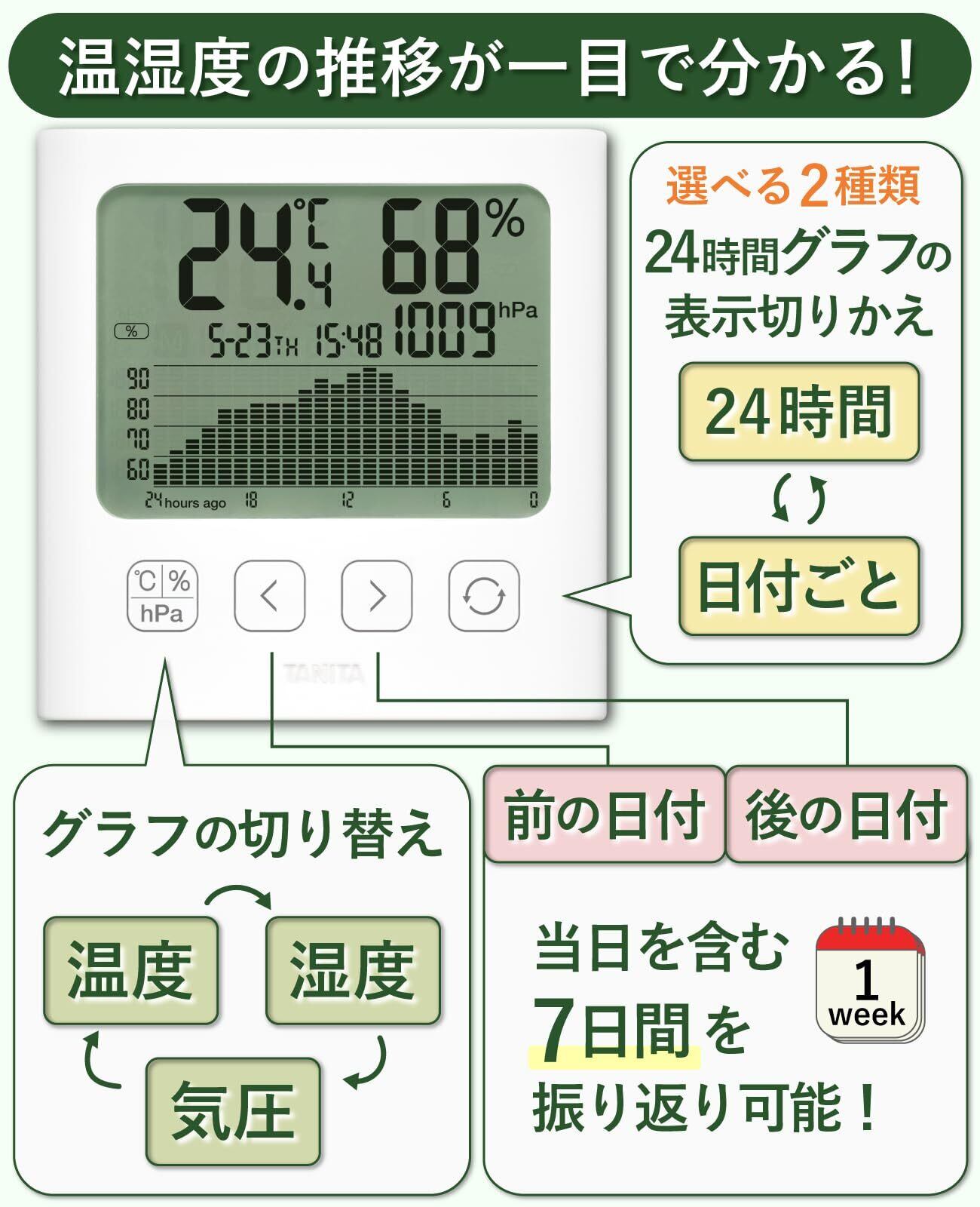 タニタ 温湿度計 気圧計【気圧/気温/湿度の変化が大画面+グラフで分かりやすい】時計・気圧計・温度計・湿度計・カレンダー TT-594(気象病 天気痛 低気圧 熱中症 ヒートショック ウイルス かび)