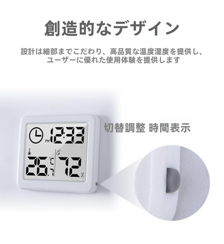 【小さいのに高性能】気温も湿度もこれ1個。夏の熱中症対策や冬の感染症対策、子供や年寄りやペットの生体管理にもうってつけです。 【設置個所自由】そのままテーブルに置けば卓上、両面テープで壁に貼り付ければ壁掛けに早変わり。部屋のレイアウトを邪魔しないシンプルデザインで、インテリにピッタリです。 【様々な部屋に適応】寝室、バスルーム、リビング、ダイニング、キッチンなど様々な場所でご利用いただけます。