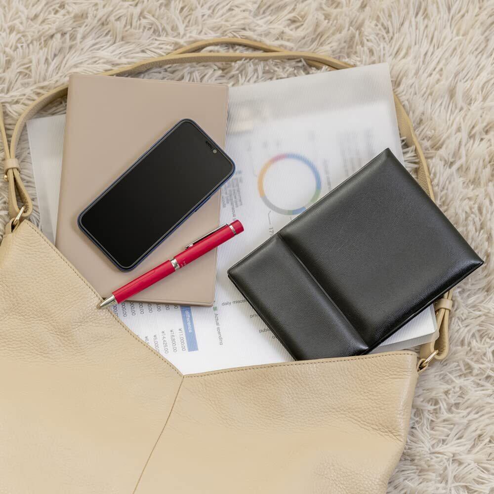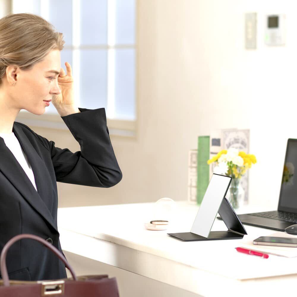【軽量・コンパクト】 従来の折りたたみミラー(当社比)よりも薄く軽いので、場所をとらずコンパクトに収納でき、引き出しやバッグに入れても邪魔になりません。旅行やお出かけ時など持ち運びに便利です。カバーはクッション素材でバッグに入れても割れにくくなっています。B6サイズの手帳と同じサイズ感で、バックに入れてもかさばらず、外出先でのメイク直しに便利です。サイズ12.5cm×17.5cm、厚み1.5cm、重量約185g