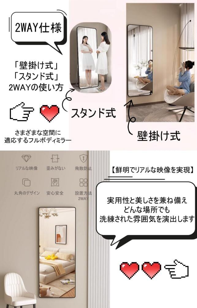 【2WAYスタイル対応の全身鏡】全身鏡は「スタンド式」と「壁掛け式」の2WAYスタイルに対応しており、さまざまな場所やシーンに柔軟に対応します。設置が簡単で、日本の住宅環境にぴったり。リビング、寝室、玄関など、どんな場所でも全身鏡として活用できます。