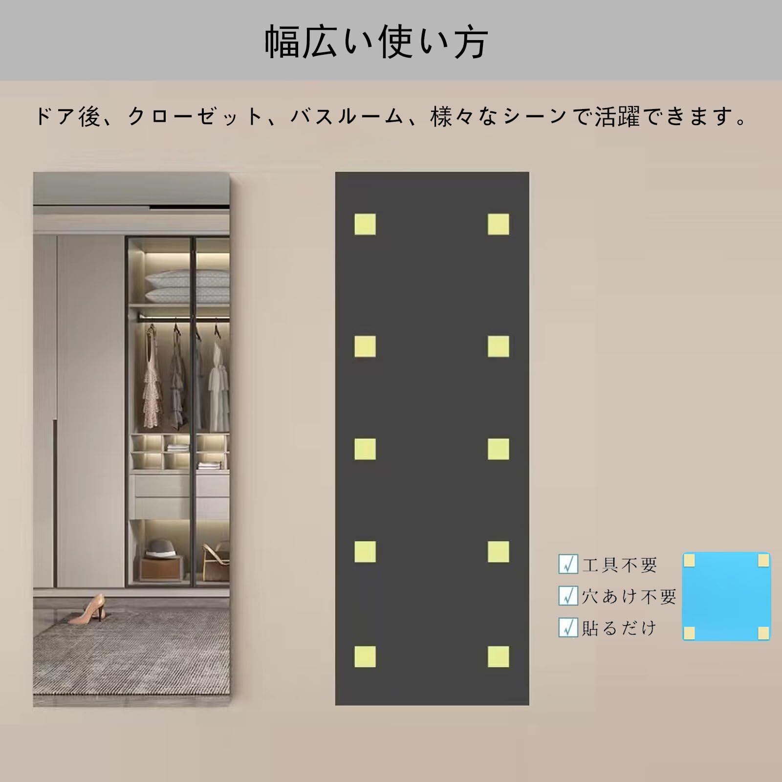 【壁を傷つけない簡単取り付け】高品質なアクリルミラーを使用し、1枚わずか500gの軽量設計。女性でも簡単に取り付けでき、全身 鏡やドア掛けミラーとして省スペースで設置可能です。両面テープ付きで釘や工具は不要。壁やドア、クローゼットに貼るだけで使える便利な鏡 シートです。
