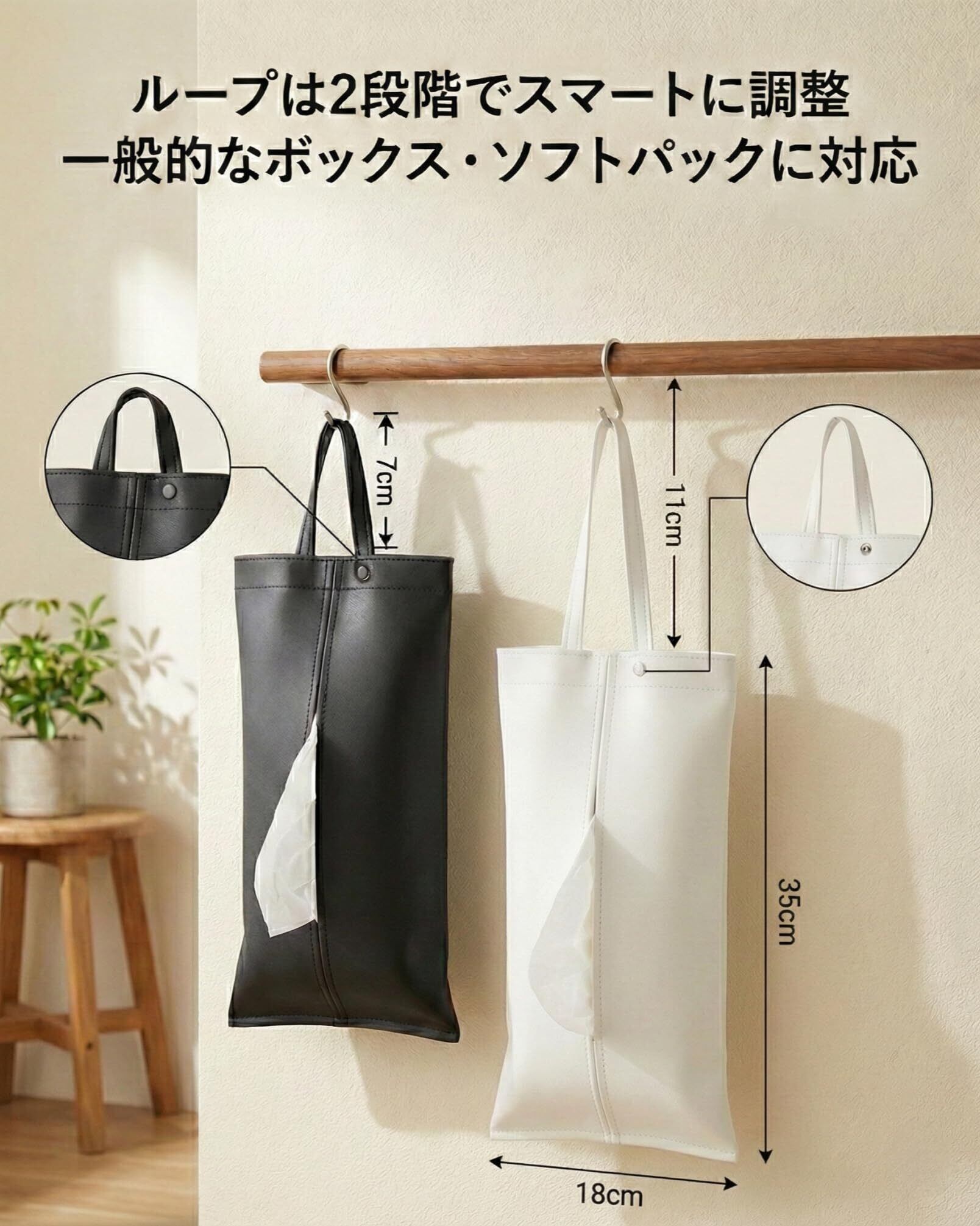 LightBeam ティッシュケース 吊り下げ 壁掛け 2WAY仕様 防水PUレザー 省スペース設計 車内・キッチン・洗面所対応 ブラック