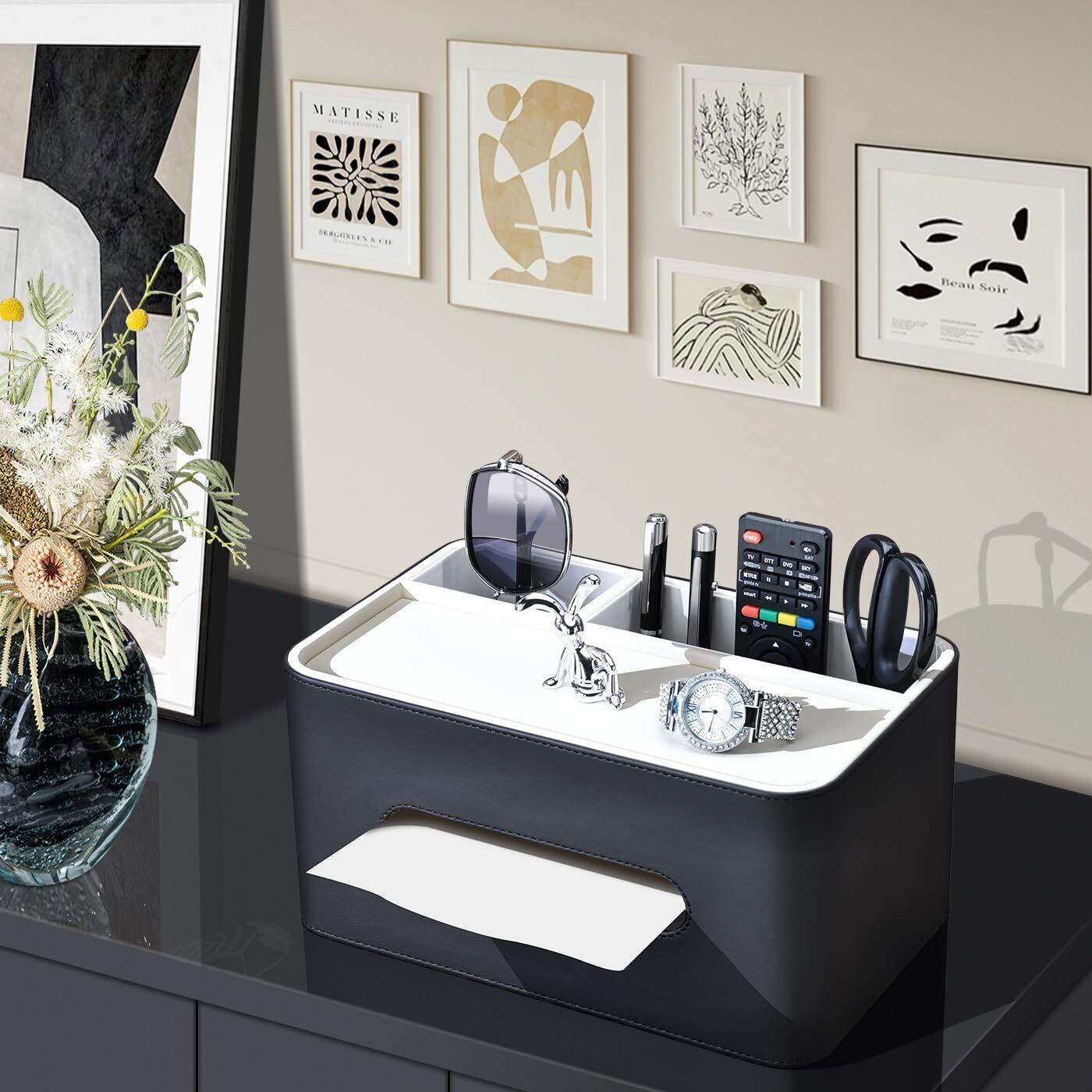 KINGFOM ティッシュケース 高級PUレザー製 ティッシュボックス 卓上収納ケース リモコン収納ボックス多機能収納ケース デスクトップ収納 小物収納 ペン立て 北欧風デザインおしゃれで実用的な卓上ティッシュボックス (ブラック×ホワイト)