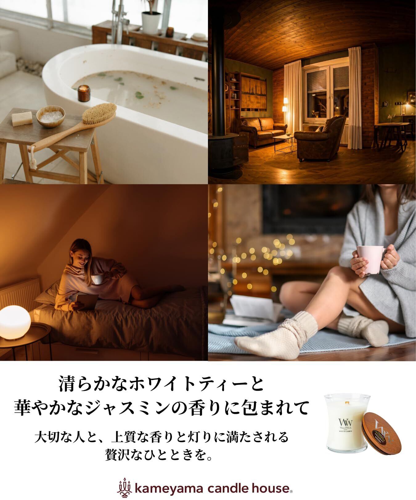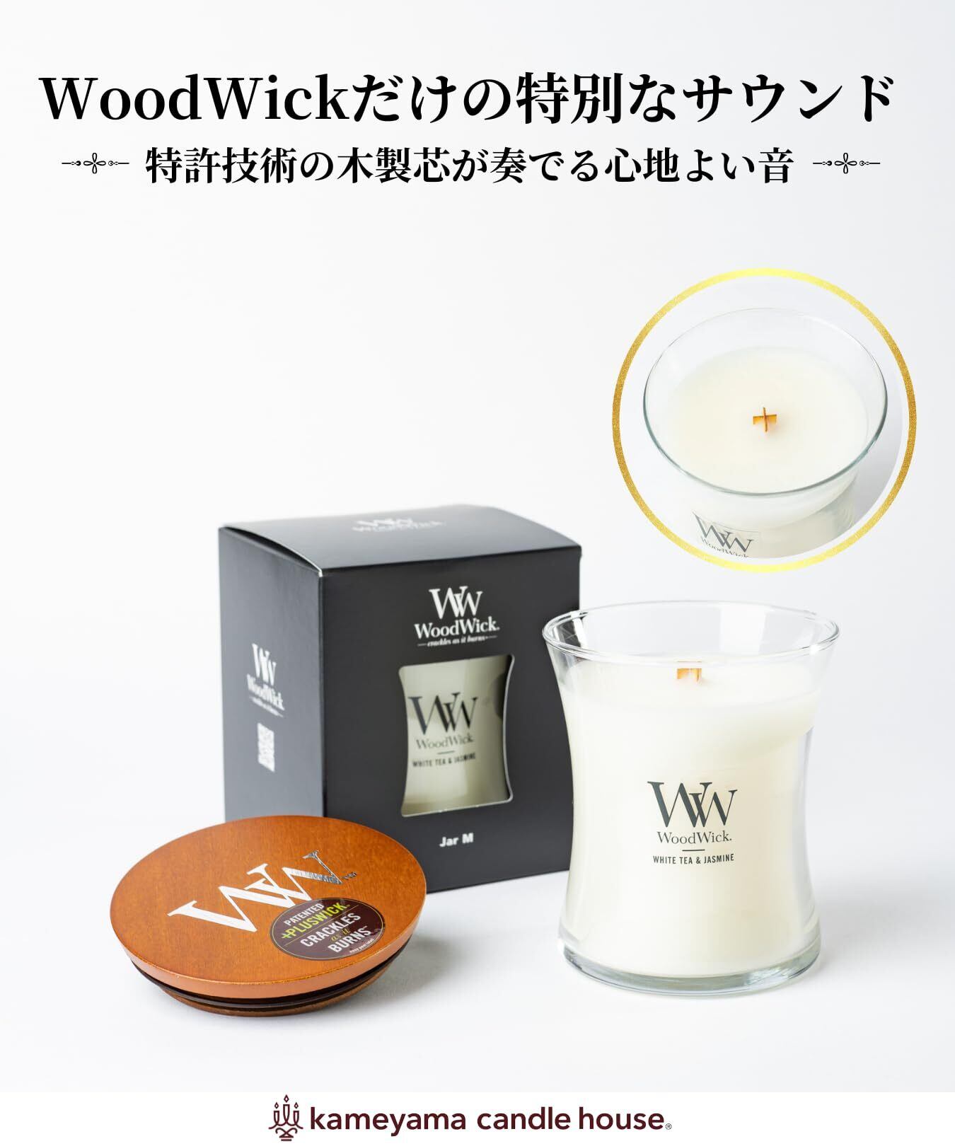 カメヤマキャンドルハウス WoodWick ジャーM ホワイトティー&ジャスミン 木製芯 パチパチ音 アロマ woodwick アロマキャンドル 焚き火の音がするキャンドル ギフト