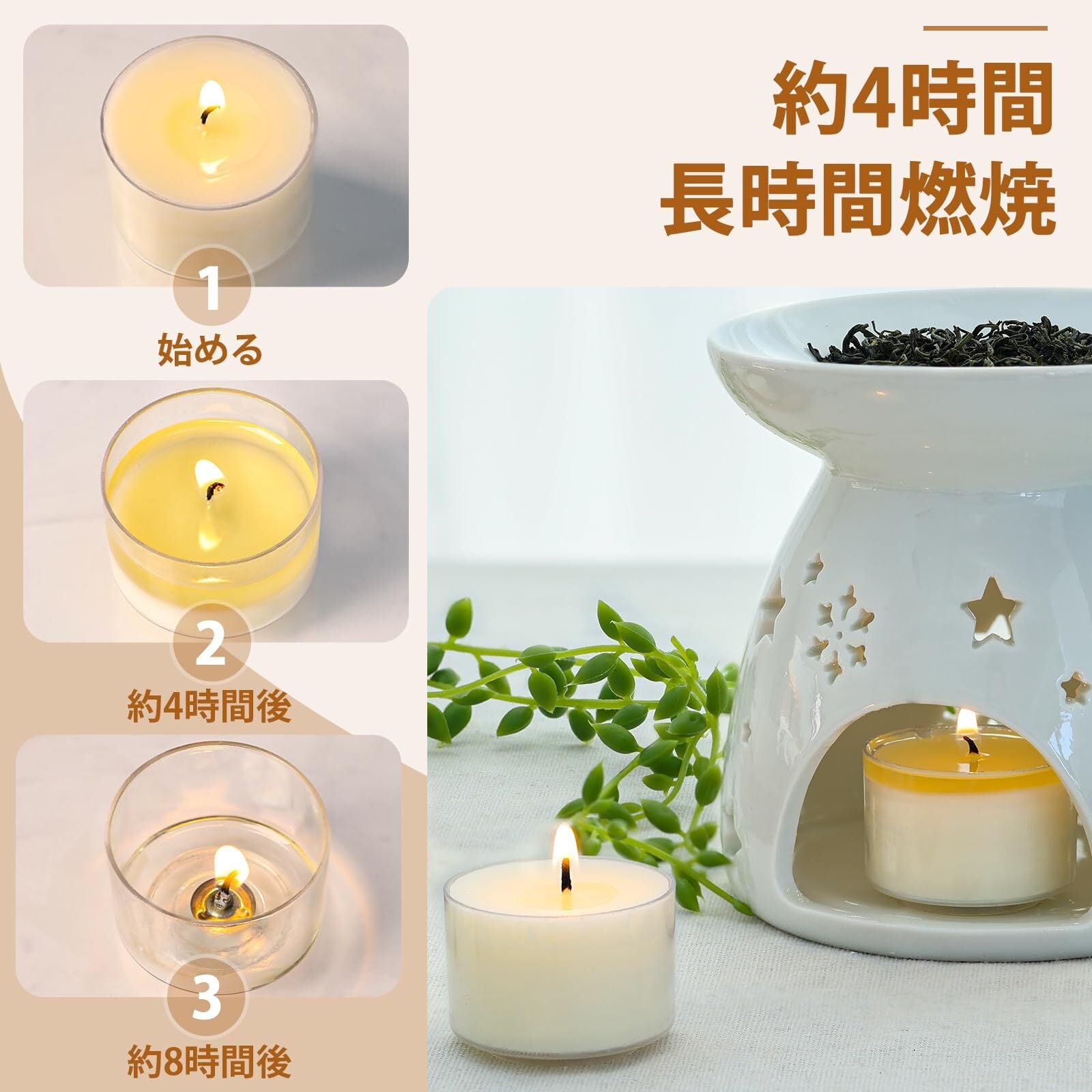 【天然植物成分で、安全かつ負担なし】LETINEのティーライトキャンドルは天然パームワックスと 100% 綿製の芯を使用しています。燃焼時にも有害物質を放出しにくく、お子様がいらっしゃるご家庭やペットをお飼いのご家庭でも安心してご使用いただけます。100% 綿製の芯は燃焼が安定し、無煙で環境に優しく、使用時の安全性と快適さを大幅に高めます。