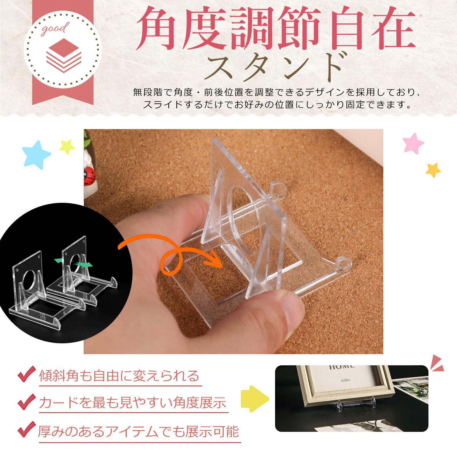 【角度調節自在のスタンド】カードスタンドは無段階で角度・前後位置を調整できるデザインを採用しており、スライドするだけでお好みの位置にしっかり固定できます。傾斜角も自由に変えられるため、厚みのあるアイテムでも安定してディスプレイ可能です。カードを最も見やすい角度で美しく楽しめます。