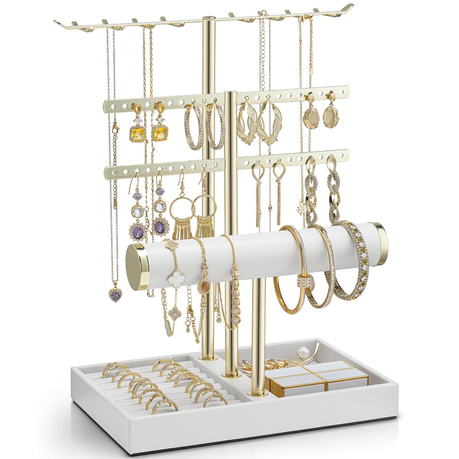 Vlando アクセサリースタンド 3段 ネックレススタンド PUレザー トレー アクセサリー収納 ネックレス ピアス リング ブレスレット フック 誕生日プレゼント 女性用(ホワイト)