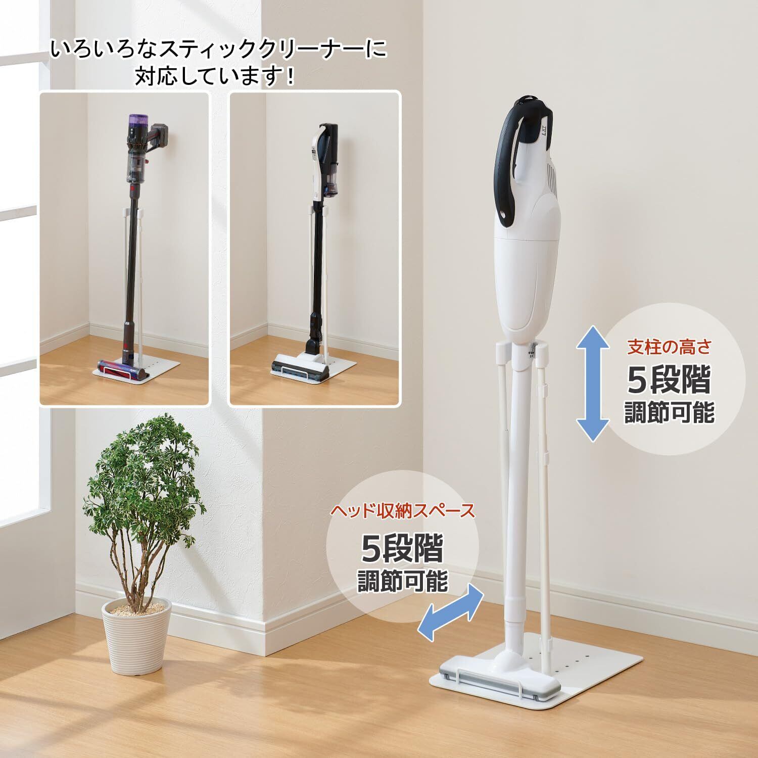 ・【支柱の高さ/5段階調節】プッシュピン方式で、支柱の高さをクリーナーに合わせて簡単に調節できます。