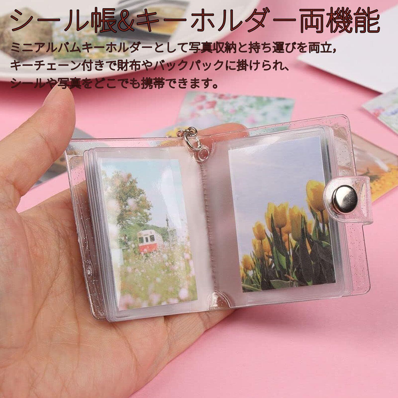 ミニシール帳:アルバム 手作りに最適なミニシール帳仕様で、1 冊に2インチ写真やシール20 枚を整理収納可能、スナップ留め構造でページの散乱を防ぎ、手作りアルバムの自由度を高めます。透明表紙にお気に入りの写真やシールを貼って DIY でオリジナルフォトキーホルダーを作れます。