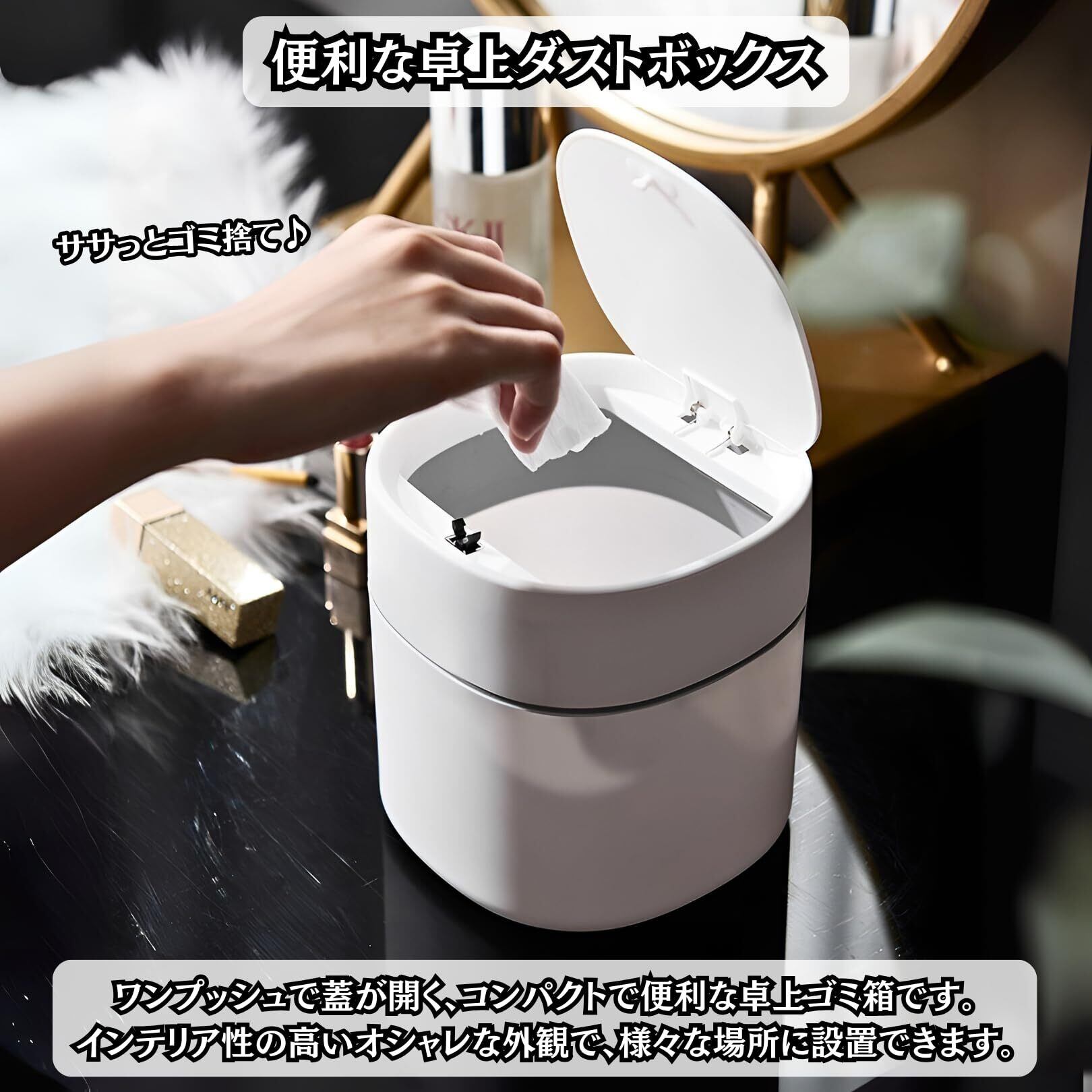 【便利な卓上ダストボックス】ワンプッシュで開く便利な卓上ゴミ箱です。コンパクトなサイズでデスクの上に置きやすく、忙しいときでも片手ですぐにゴミを捨てることができます。