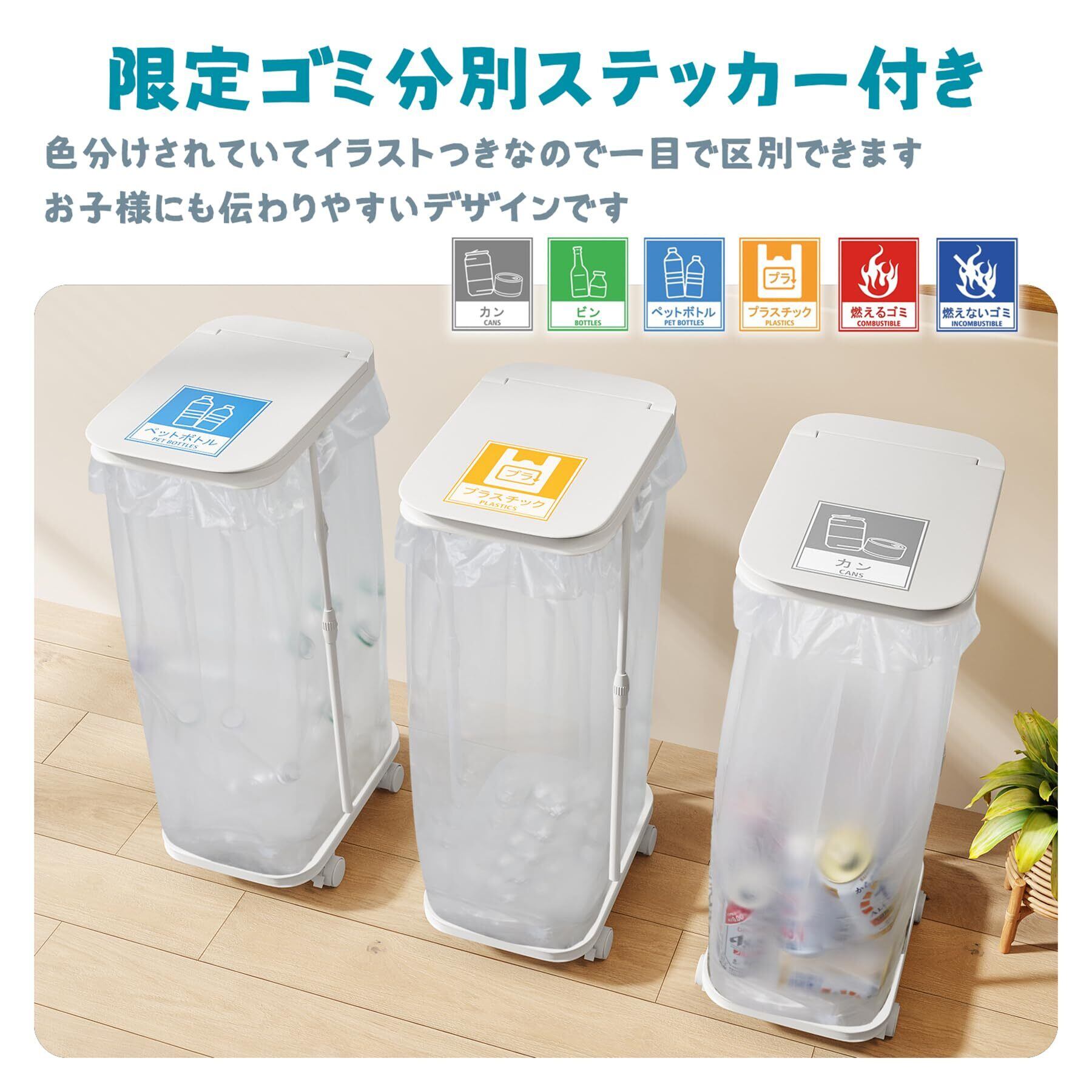 ゴミ袋ホルダー ゴミ分別 ゴミ箱 45l 容量調節可 20L~90L ゴミ袋対応 ふた付き スリム おしゃれ 分別ゴミ箱 キャスター付き 【限定分別シール付】 底板あり ホワイト