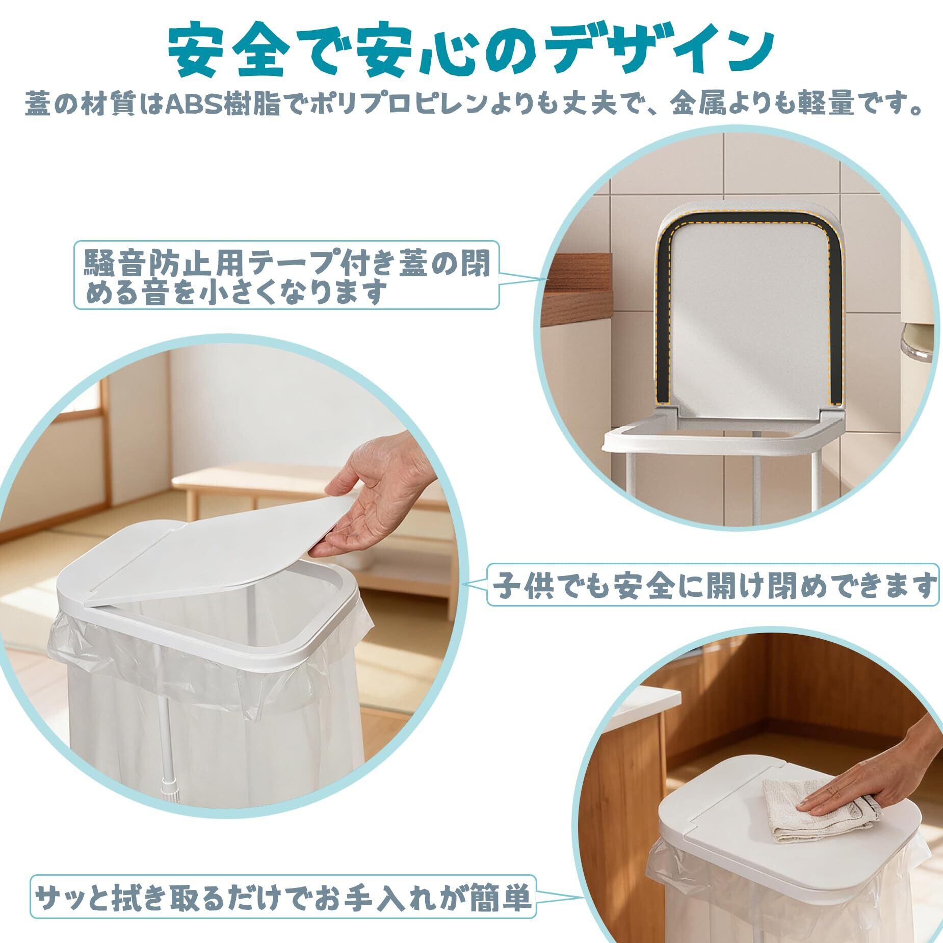 【シンプルデザインで掃除が楽になります 】ゴミ箱の汚れが気になりませんか?本製品は壁なしで袋をかけるだけです。蓋が汚れたら水で直接洗えるので、手軽に清潔に保てます。キャスターとフットパッドが付属するので場所に応じて設置ができます。キャスターがないと、掃除機を使うなどで動かすのに不便です。360度キャスター付きで、スイスイ移動できてとても便利です。この商品を使って、ゴミ箱の汚れストレスから解放!