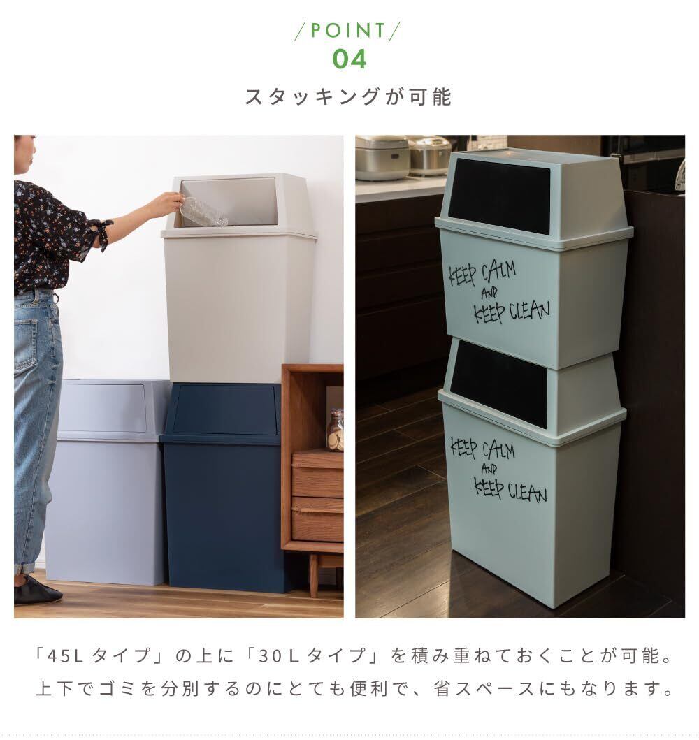 ●スタッキング可能・・・積み重ねができるため、少ないスペースで設置可能。30Lと45Lを組み合わせて積み重ねてもOKです。