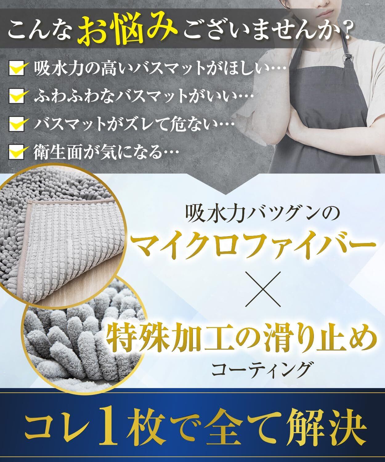 【驚異の1秒吸水力を実現】水を1秒で吸水する驚異の吸水性実現!お風呂上がりについた水滴も一瞬で吸収するから不快な冷たさが残りません。また、今人気の40×60cmの使いやすいサイズなので多少の飛び散った水も幅広くカバーし、すべて吸水します。水回りの悩みはこのバスマット1枚でバッチリ解決。
