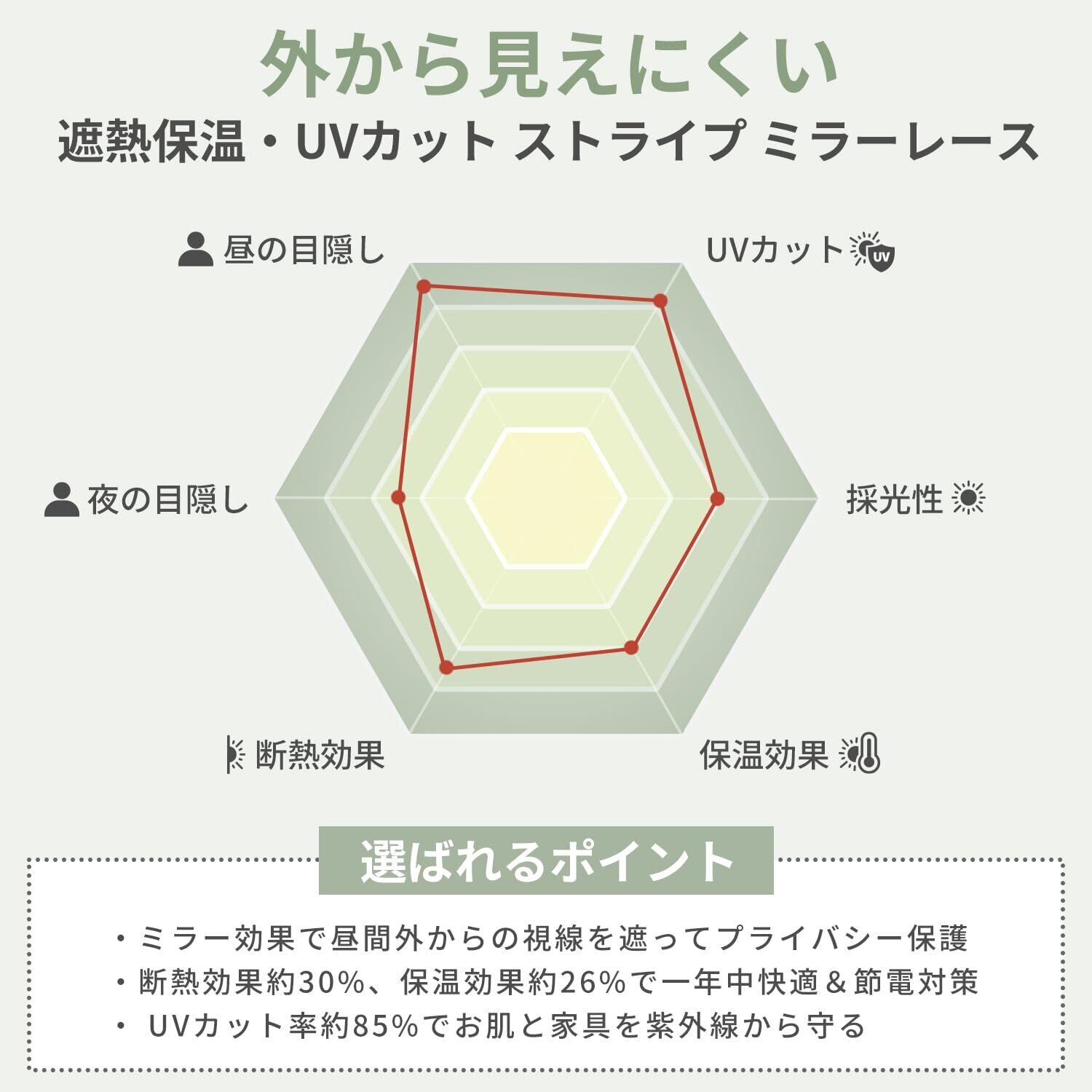 【外から見えにくいミラー効果】裏面に施された光沢糸が外からの光を反射し、昼間の視線をやわらかくカット。外の景色や自然光を楽しみながらも、室内の様子が見えにくい構造でプライバシーをしっかり守ります。明るさと開放感をそのままに、安心できる窓辺を演出します。※夜間や曇りの日は厚地カーテンとの併用をおすすめします。