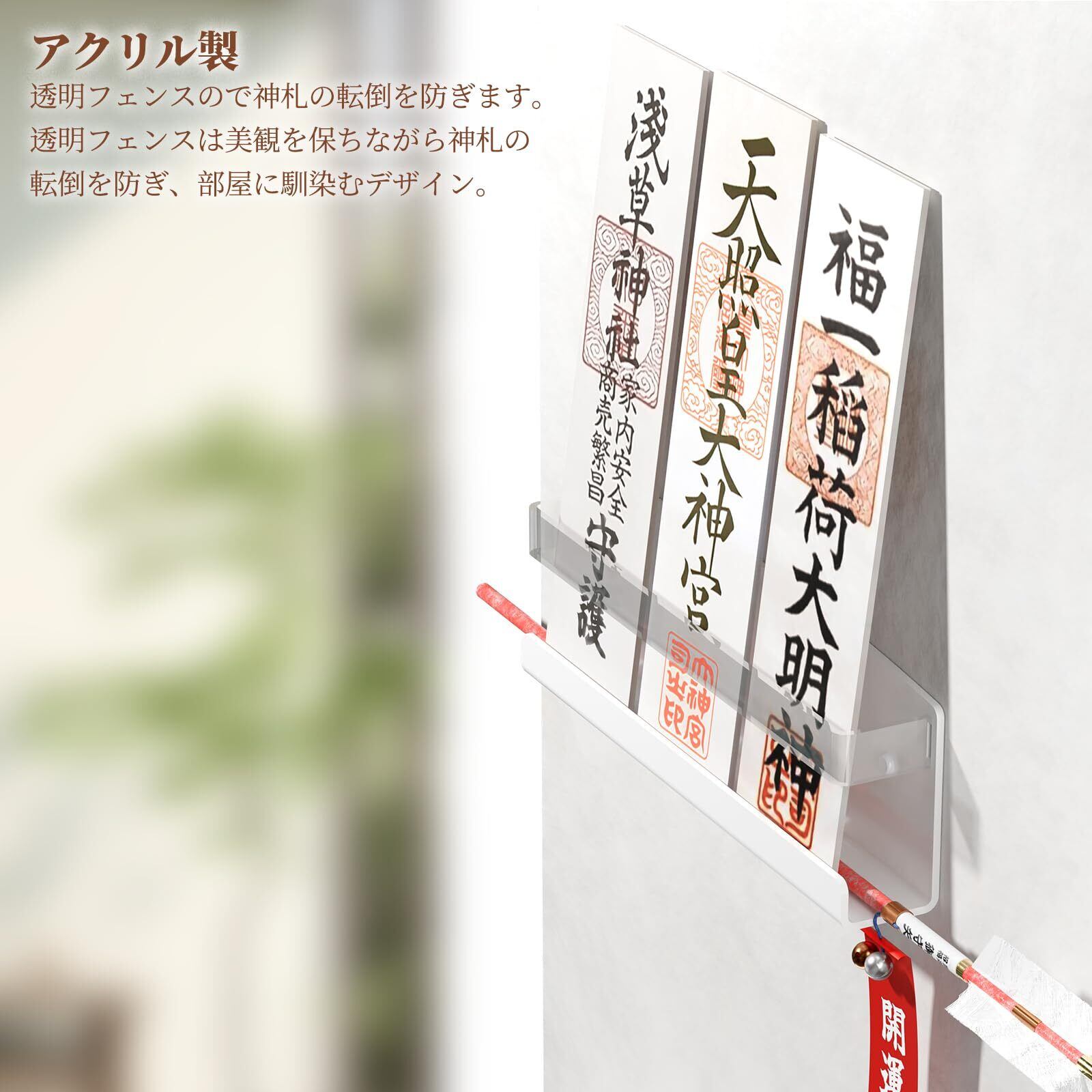 【御札立て・簡易神棚】本体は陶器のように真っ白なアクリル制で、フェンスには透明アクリルを使用しています。透明フェンスは美観を保ちながら神札の転倒を防ぎ、掃除もしやすく、管理のしやすい神棚であるのも特徴的です。