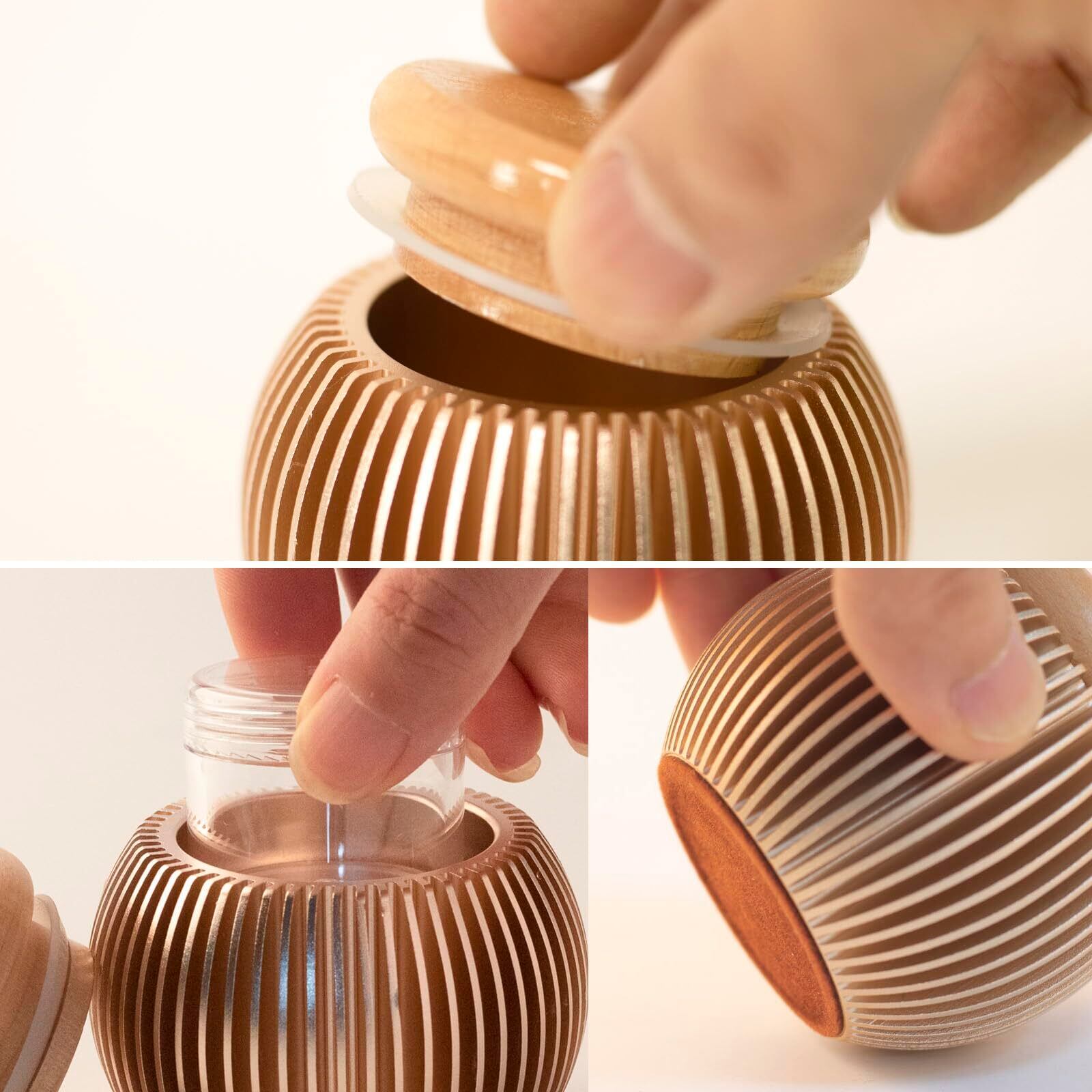 【両手で包み込める程よいサイズ】 骨つぼサイズ:外寸法:直径6.6cm×高さ5.7cm/内部収納有効寸法:直径約4.1cm×高さ約3.5cm/材質:アルミ製+天然木ブナ材無垢+透明アクリルボトル。抱きかかえた時にしっくりする、丸いデザインにこだわりました。大切な人とペットちゃんの遺骨や毛髪を納めて、身近にいつでも手を合わせることが出来るところに置いて手元供養します。