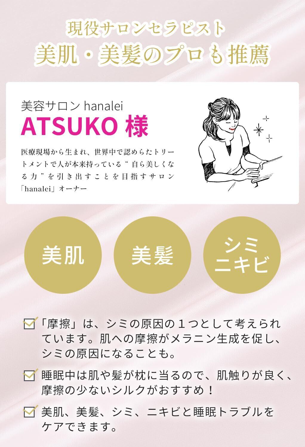 【抗菌性・静電気防止】シルク繊維は天然の保湿成分セリシンで覆われており、静電気が発生しにくい。シルク枕カバーは綿より約1.5倍の保湿性と吸湿性があります、保湿性や通気性、保温性に優れているだけでなく、抗菌性にも優れているのでとっても衛生的。にくく抗菌性にも優れているので、衛生的で安心してお使いいただけます。