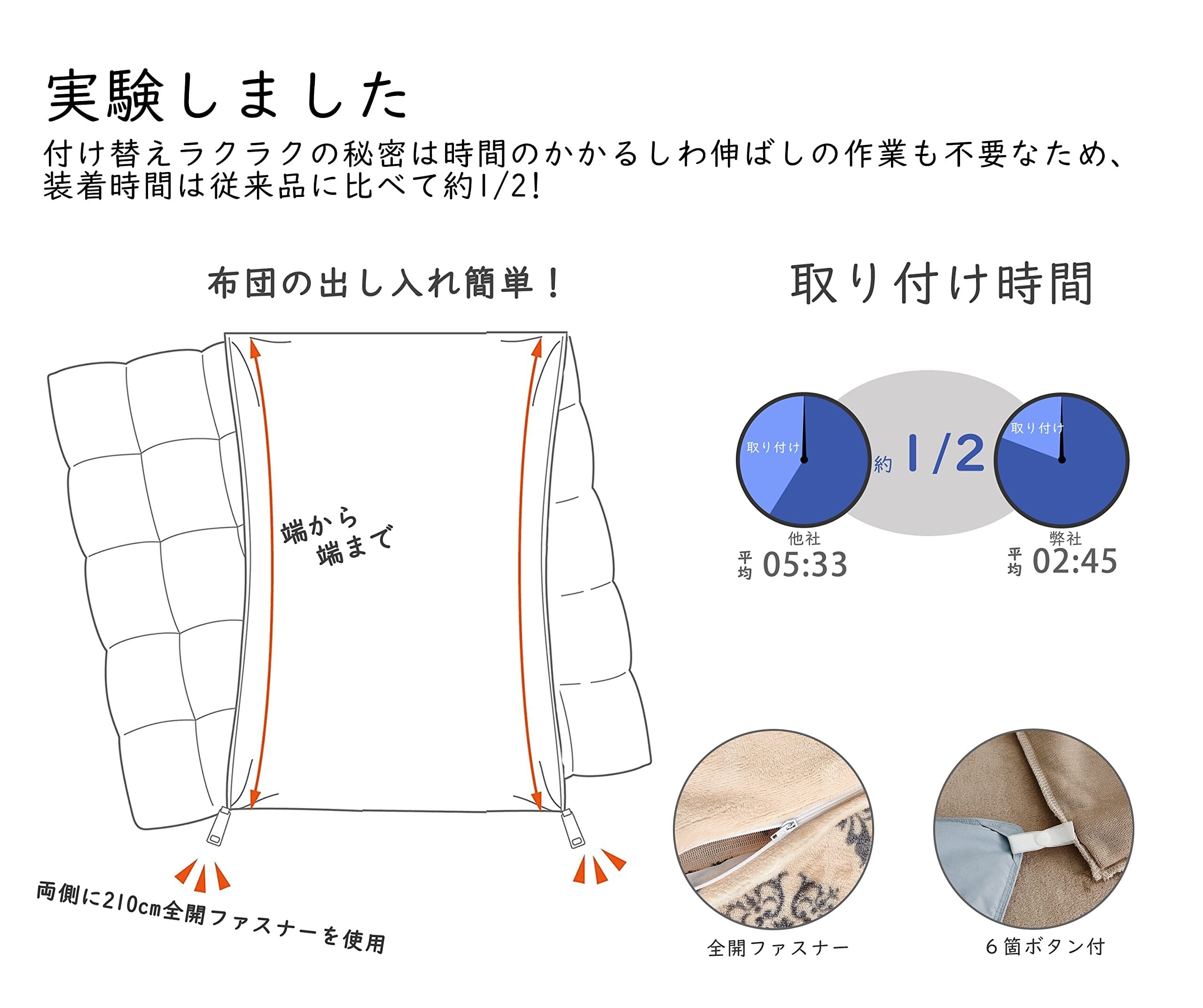 【生地】:ポリエステル100%、フランネルで毛布タッチの掛け布団カバー。表面の起毛が、手で触るともふもふ感があり、ふんわりしています。繊維間の密度がとても高く柔らかいのが特徴です。また、程よく暖かい空気を含んでくれますので、布団へ入った瞬間に暖かく感じます。毛玉になりにくいので、耐久性が高く、長時間使用しても問題ありません。