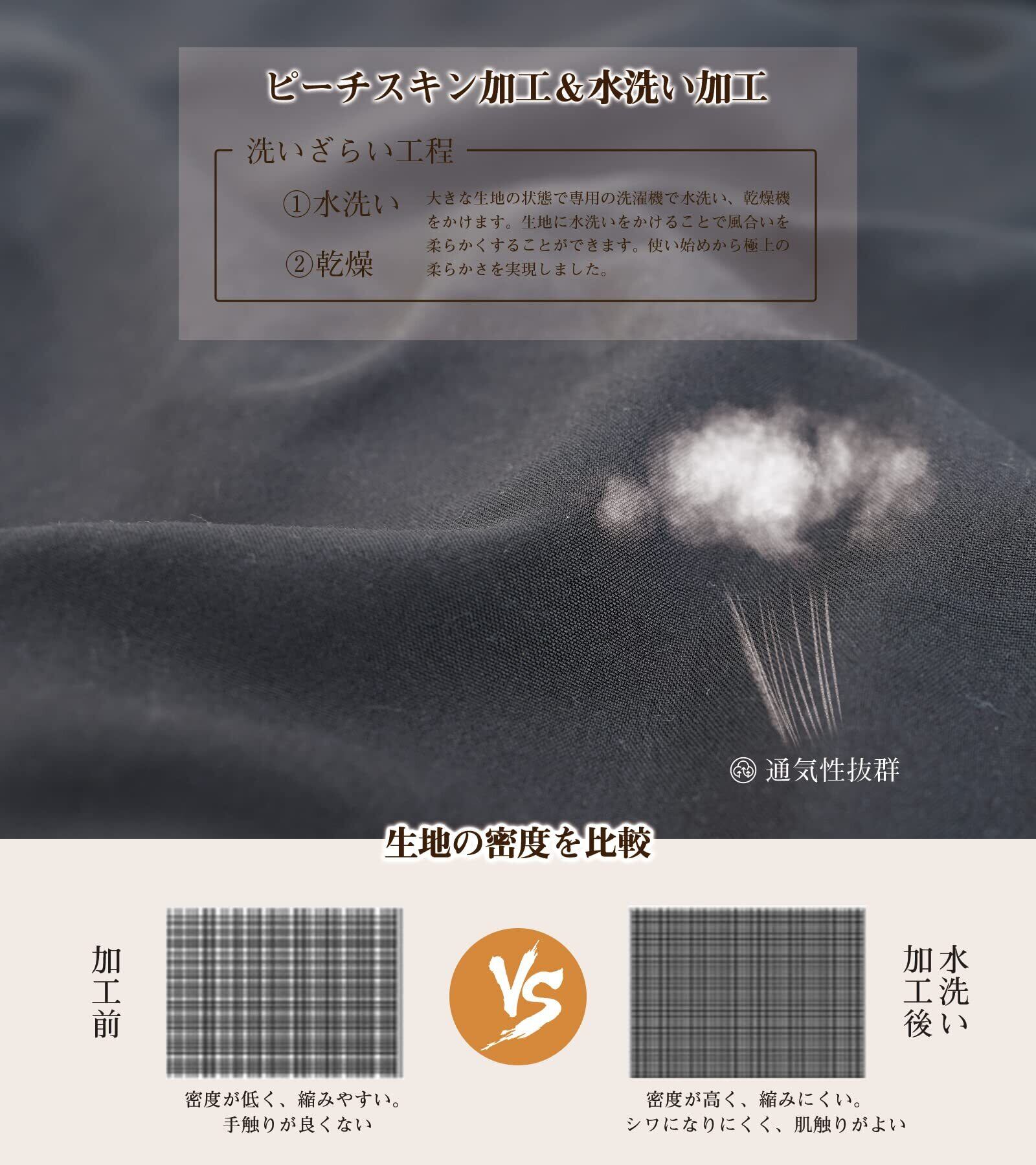 【超柔らかいタイプ:ピーチスキン&水洗い加工】一般的な枕カバーと比べると、高密度の生地を厳選し、表面にピーチスキン加工を施し、薄起毛による風合い豊かでなめらかでしっとりとした肌触りに仕上げました。➡️ 更に、生地に洗いをかけることで使い始めから極上の柔らかさを実現しました。届いた日からやわらかな肌触りを楽しめます。