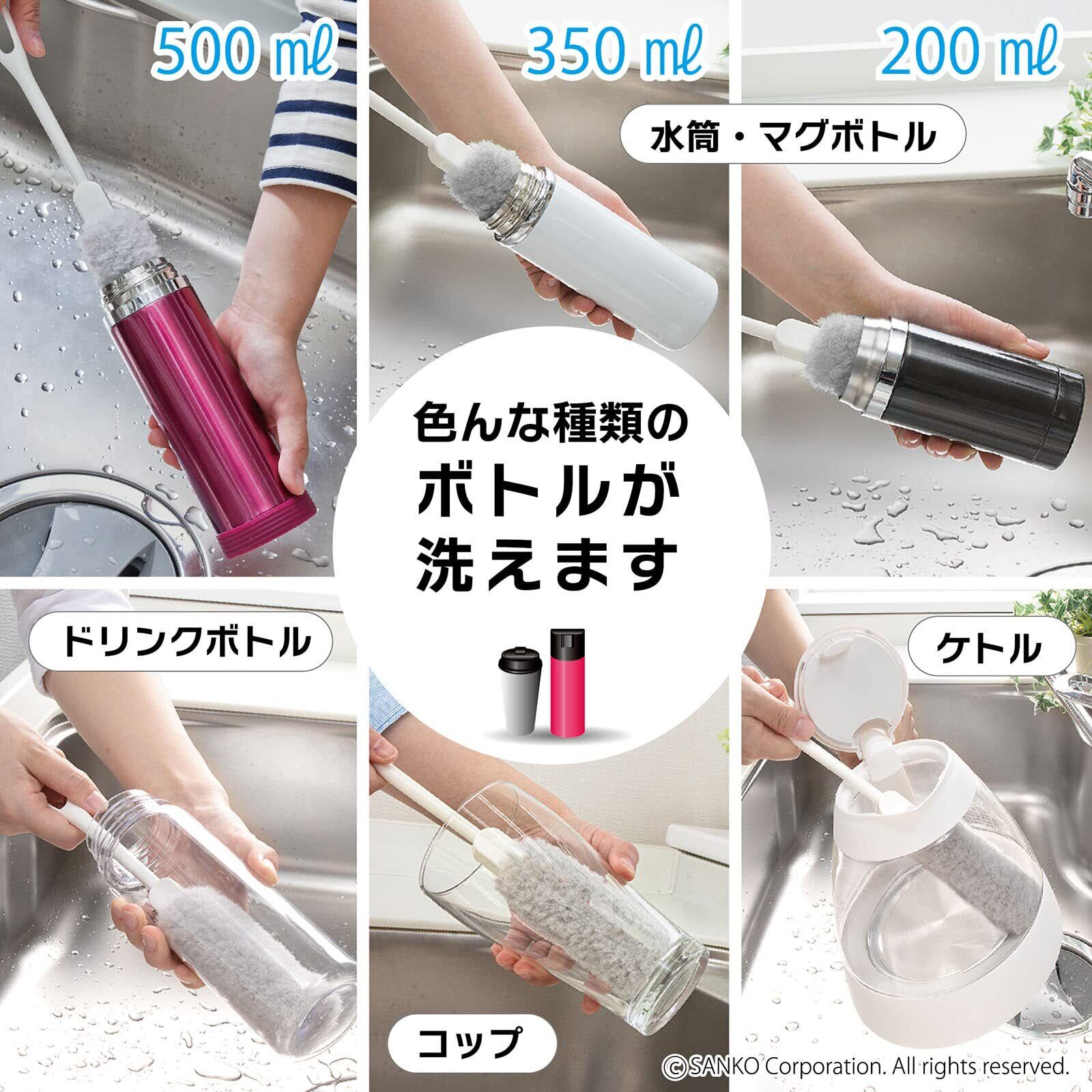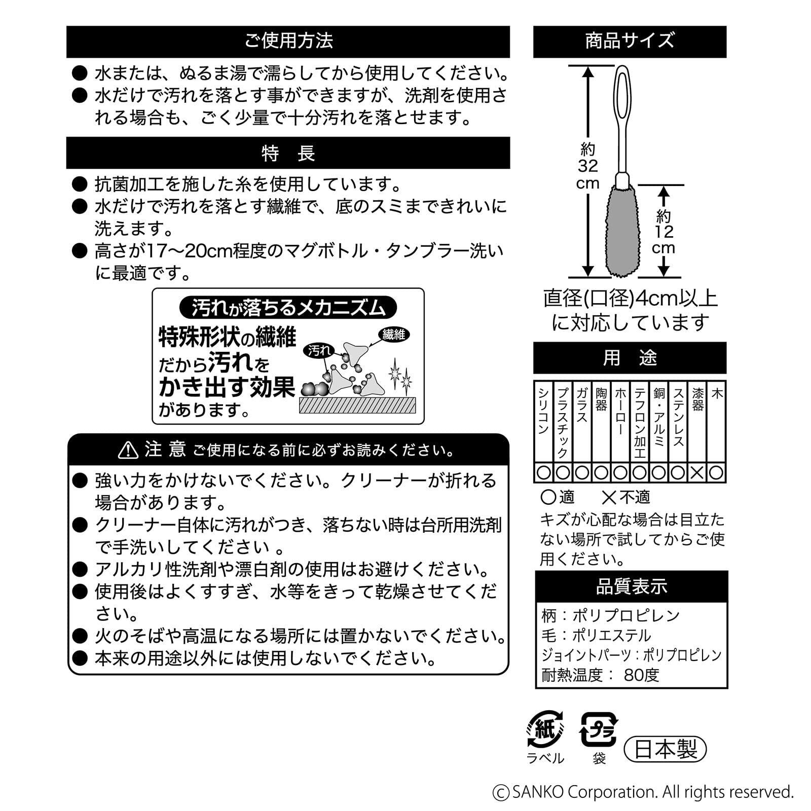 【日本製】サンコー ブラシ マグボトル洗い 水筒 ミニ ボトル タンブラー 哺乳瓶 水だけでも汚れが落とせる特殊繊維 コップ 洗い ブラシ 抗菌加工 びっくりフレッシュ グレー BI-15