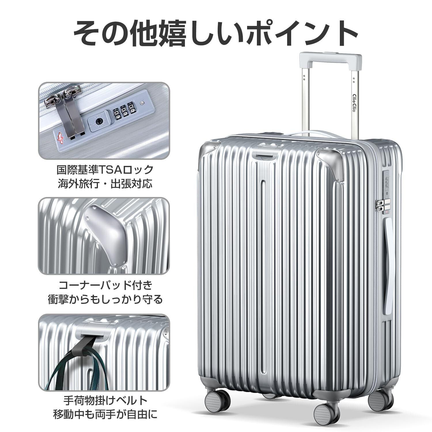 [ClioClio] スーツケース キャリーケース キャリーバッグ 拡張機能付 超軽量 静音 鏡面加工 【360度回転 & 取り外す可能】 ABS+PC 耐衝撃 防盗ファスナー TSAローク搭載 旅行 ビジネス 出張 (シルバー, Mサイズ(4~7泊/65L)))