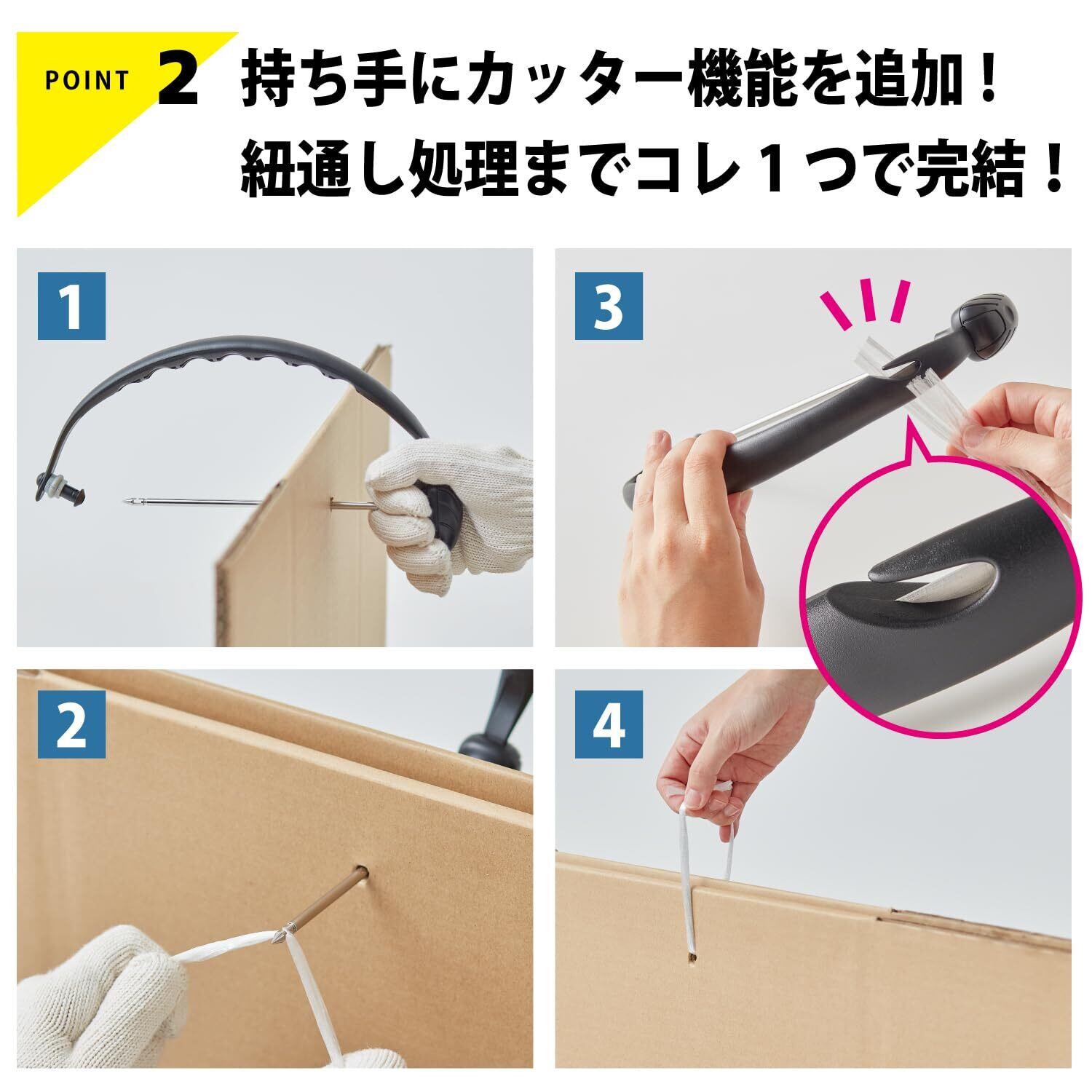 <人気商品がバージョンアップ>お客様のお声を反映!使い勝手もBIGに進化!カッター付きだから整理から処理までコレ1つで完結。段ボールの持ち運びをラクに!握りやすいグリップで疲れにくい。バラつきがちな段ボールを突き刺してまとめるだけ。紐を通せるフックが付いているから面倒な紐通しもラクラク!約14~16枚収納可(最大約6kg)※段ボールの厚さや大きさにより異なります。【Point.1】長さ1.5倍で収納力UP!【Point.2】持ち手にカッター機能を追加!紐通し処理までコレ1つで完結!【Point.3】ロック部分が凸型になって操作しやすい! 【使用上の注意】●作業時は、周りに人がいない事を確認してください。また本品先端の近くに絶対に手を近づけないでください。●ロック部が動きにくい場合は、無理に動かさず先端をキャップの奥まで差し込んでからスライドさせてください。●先端が鋭利ですので、取り扱いには十分ご注意ください。●使用時は必ず安全手袋を着用し、ケガや事故には十分ご注意ください。●段ボールの種類によっては突き刺しにくい場合があります。●収納目安に従ってご使用ください。●持ち運ぶ際や、保管時は必ずロックをしてください。●変形・破損した場合は、直ちに使用を中止してください。●お子さまの手の届かない所に保管してください。●本来の用途以外に使用しないでください。●火気厳禁。