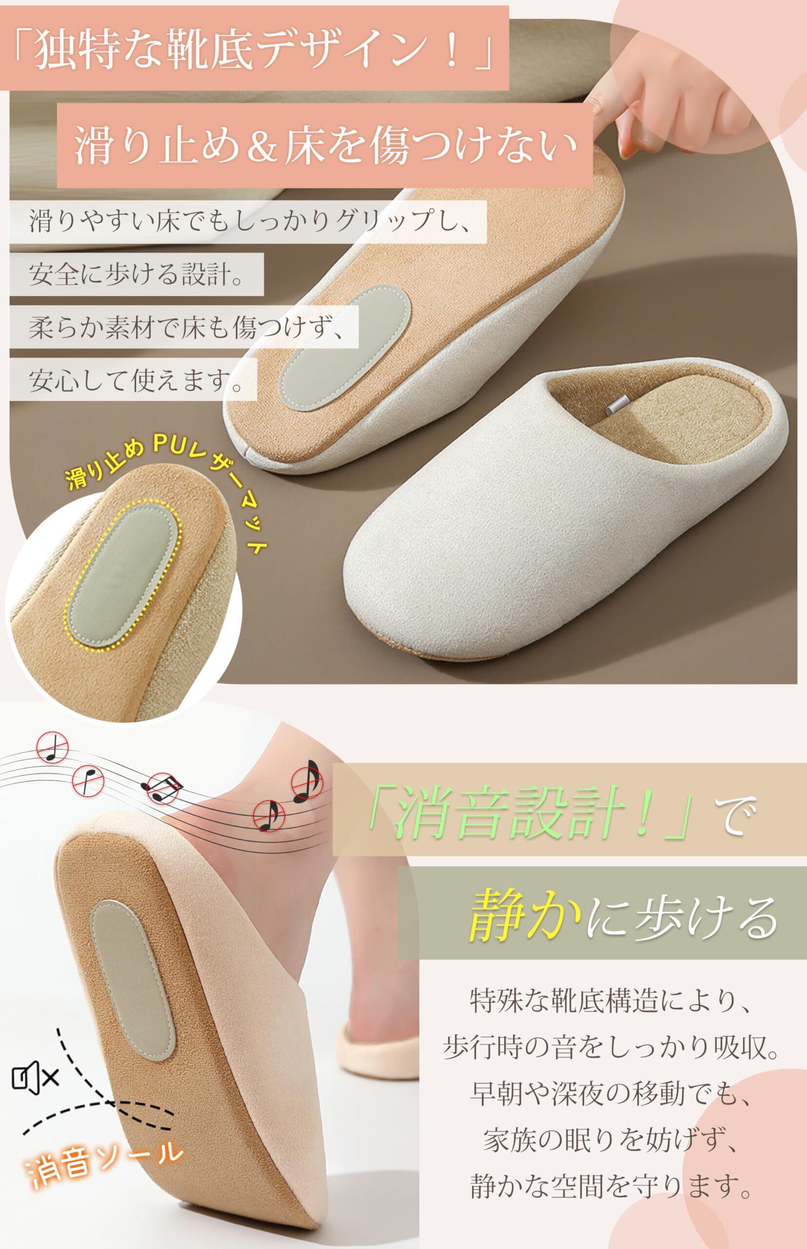 【「おうち時間にぴったり!」超軽量ルームシューズ】寒い季節のおうち時間を快適にしてくれて、超軽量で履き心地抜群のルームシューズです。もこもことした内側が足元をやさしく包み込んで、履いた瞬間から暖かさを実感し、クッション性にも優れており、まるで雲の上を歩いているような柔らかな踏み心地です。防音ソール設計で、歩く音をしっかり抑えてくれるので、集合住宅や夜間の使用でも安心し、洗濯機で丸洗いできるので、お手入れも簡単で、いつでも清潔に保てます。春・秋・冬の3シーズンに対応しており、冷えやすい足元をしっかりと守ります。デザインもシンプルで、男女問わず使いやすいのもポイントで、家族でおそろいにもおすすめです。※環境に配慮した真空圧縮袋で丁寧に梱包しており、ホコリや汚れなどの外部からの汚染を防ぎ、商品を清潔な状態でお届けします。開封直後に圧縮によるシワや跡が見られる場合がありますが、4〜5日ほどご使用いただくうちに自然に元の状態に戻りますので、あらかじめご了承ください。