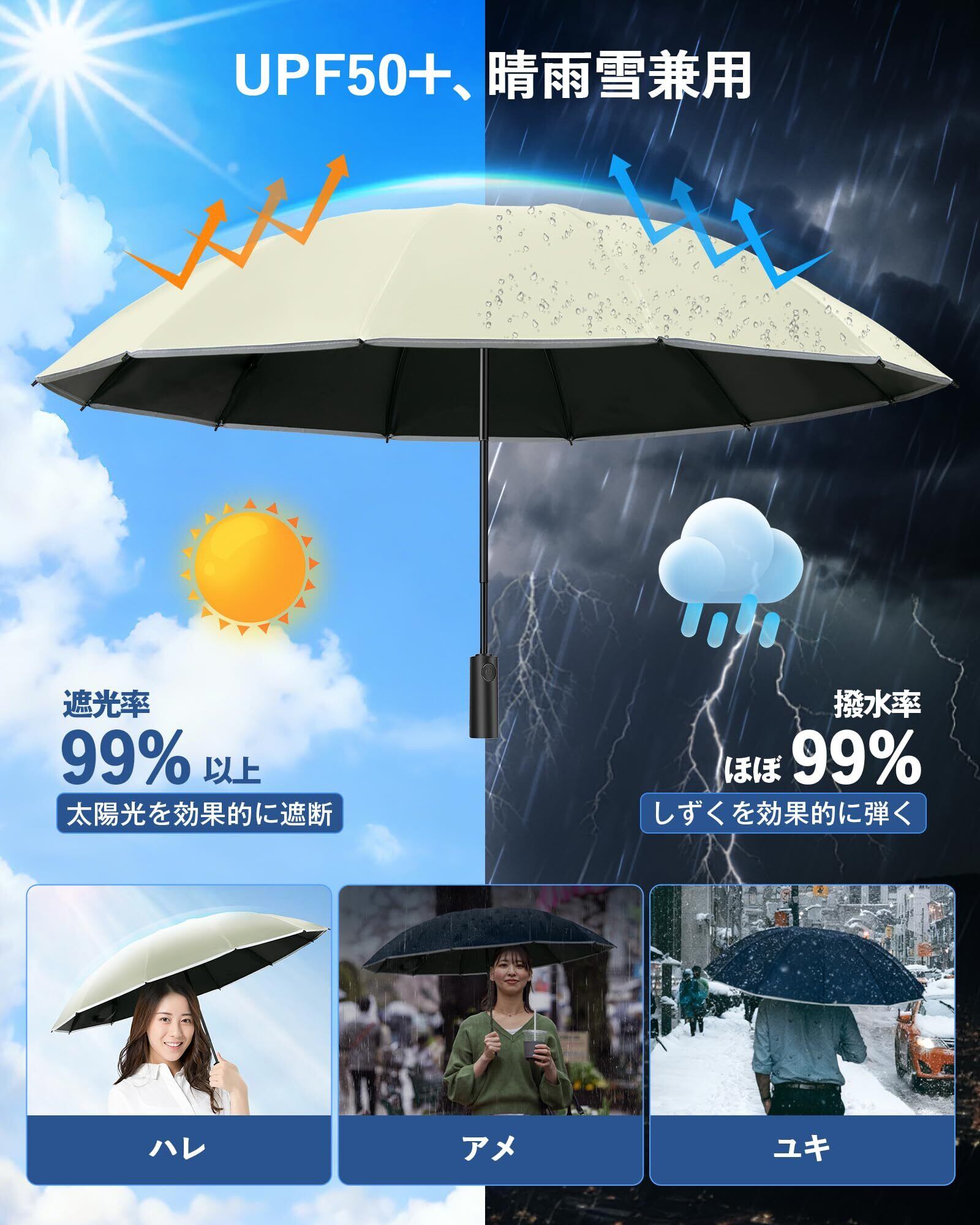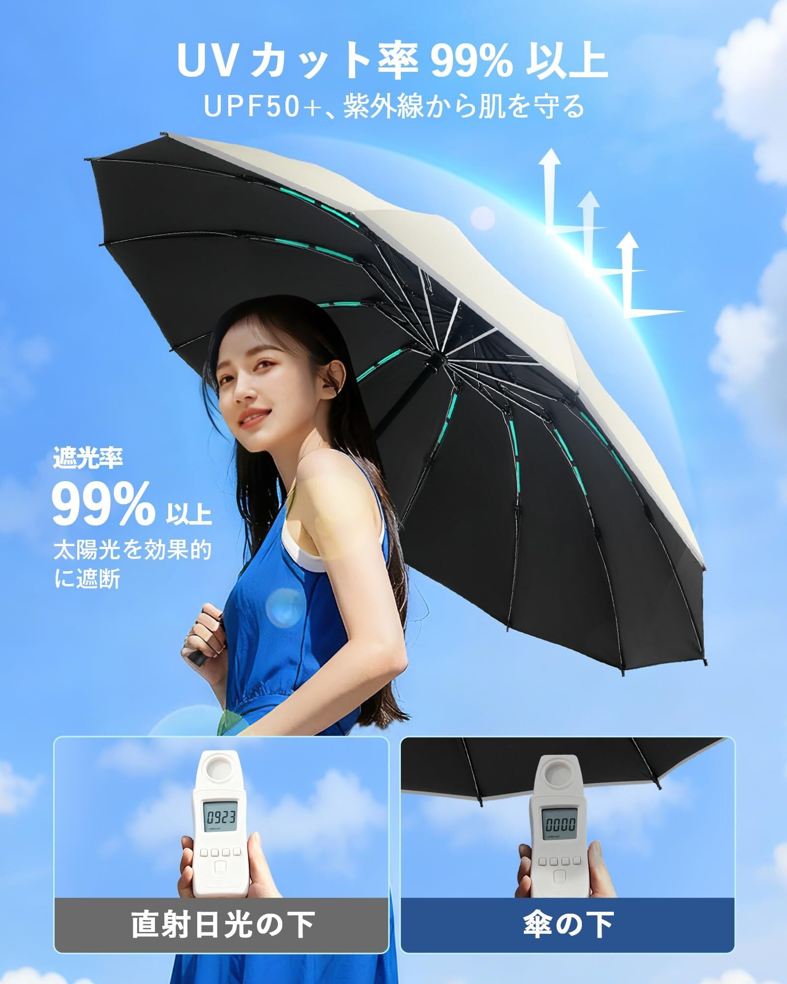 【遮光遮熱UVカット&晴雨兼用】日傘として、内側に遮光遮熱素材を採用し、UPF50+・99%以上のUVカット率&遮光率を実現し、晴れの日には紫外線と日差しをしっかり遮断できます。雨の日だけでなく、晴れの日にもご利用いただけます。*商品は出荷前に検品しておりますが、ご使用中に何か問題がございましたら、お気軽にお問い合わせください。迅速に対応させていただきます。