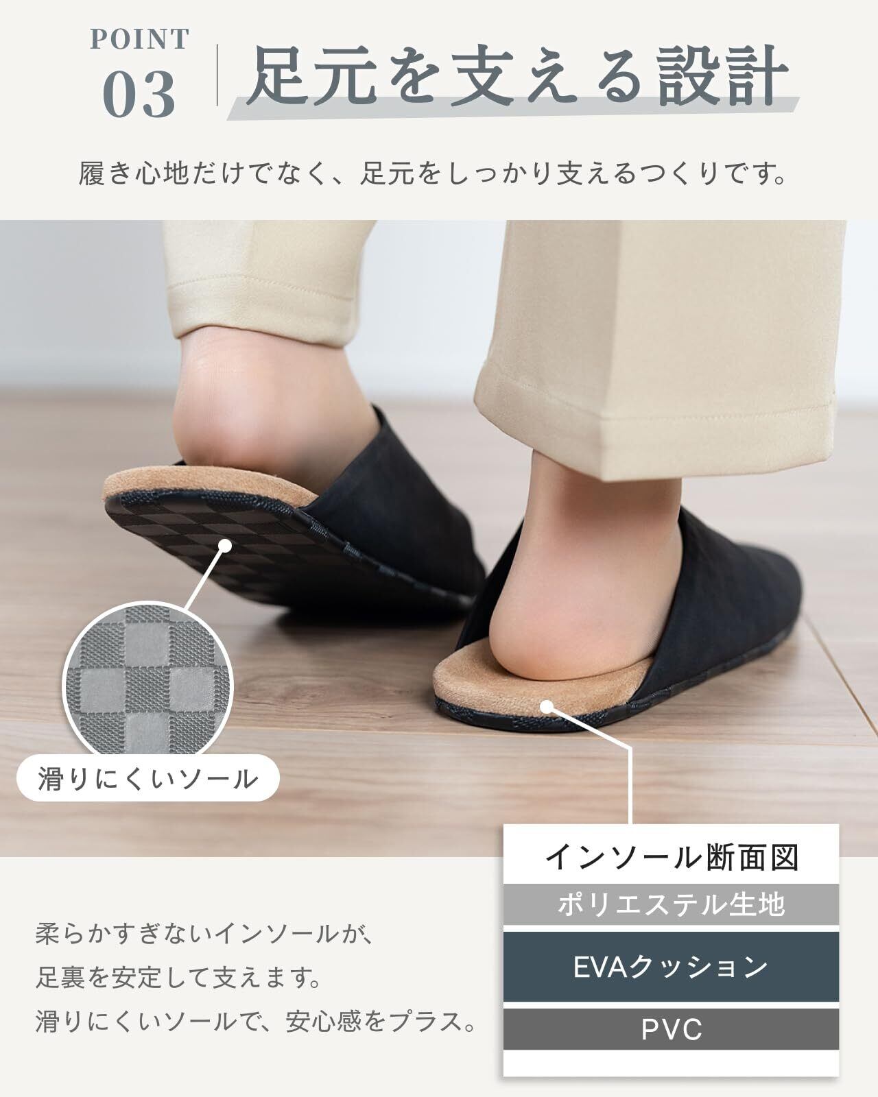 【歩きやすくて静か。快適さにもこだわったスリッパ】形がしっかりしており、履いたときのシルエットが崩れにくい設計。甲が深めで足が安定し、パタパタ音がしにくい静音仕様。甲の切り込みが足の動きに合わせてフィットし、長時間でも快適に過ごせます。クッション性のあるインソールと滑りにくいソールで、学校内の移動もスムーズです。足先はとがらず、歩行時のストレスを感じにくい自然なラインに仕上げています。
