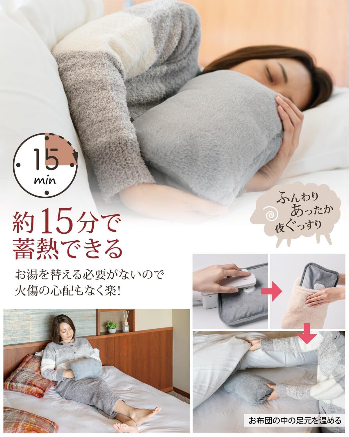 お湯の交換不要な電気蓄熱式湯たんぽです。 本体も起毛素材でふんわり、もふもふの専用カバーも付属しています。 蓄熱式なので、お湯の入れ替えの必要がありません。 約15分間蓄熱するだけで4~10時間も暖かさが持続します。 蓄熱時以外は、コードレスですので、どこにでも持ち運び可能です。