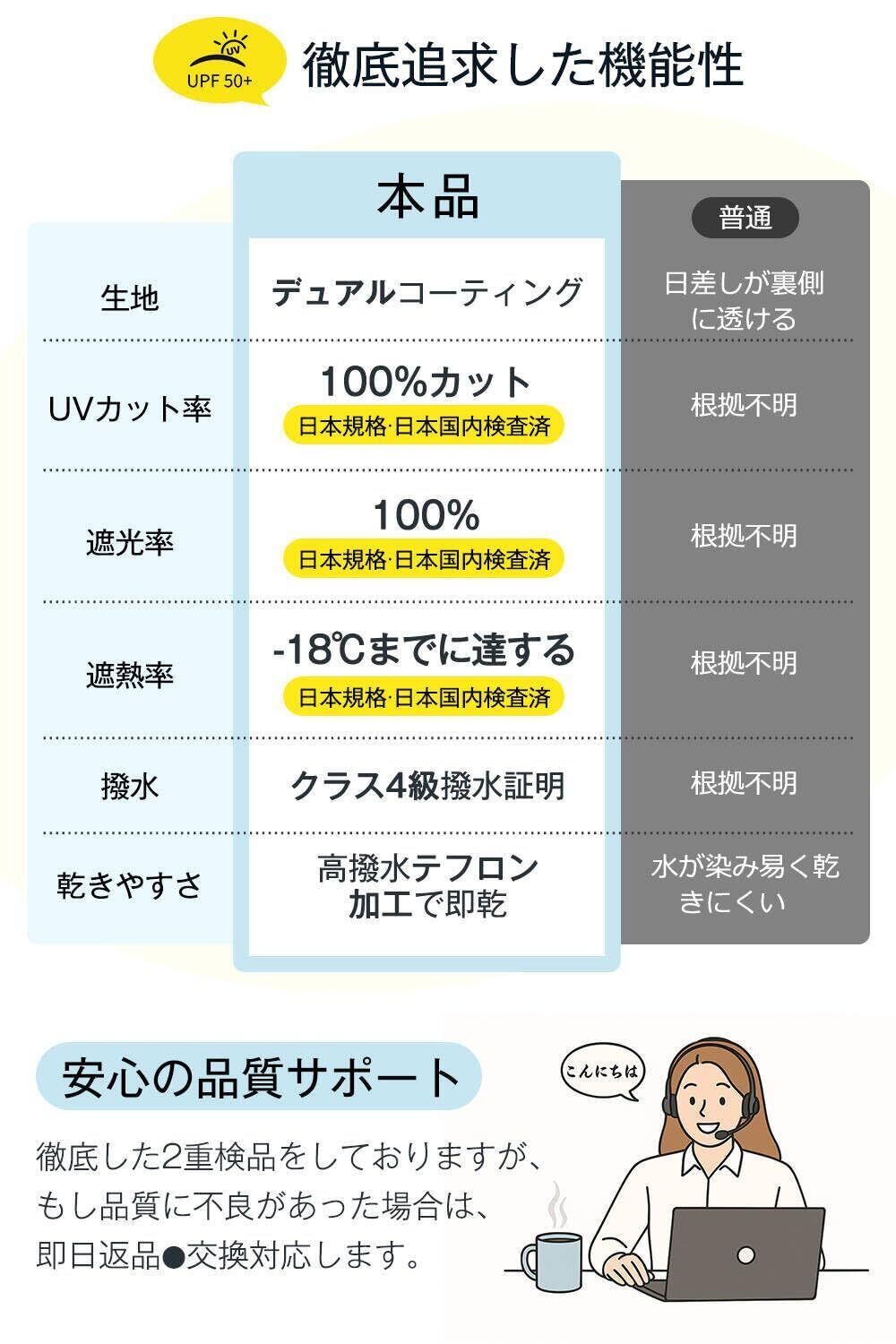 【UVカット 完全遮光傘】JIS規格に基づく厳格なテストをクリアした完全遮光&100%UVカットを実現。高密度生地に多層遮光コーティングにより、強い日差しを遮り、紫外線を100%ブロック、光透過率0、UPF50+の日傘で、大切なお肌を守ります。熱線となる太陽光線をカットするため、ジリジリ日差しの中を歩いても、日陰ができたみたいに涼しく保ち、炎天下でも紫外線を恐れません。真夏を乗り切る日焼け対策・暑さ対策グッズに最適です。