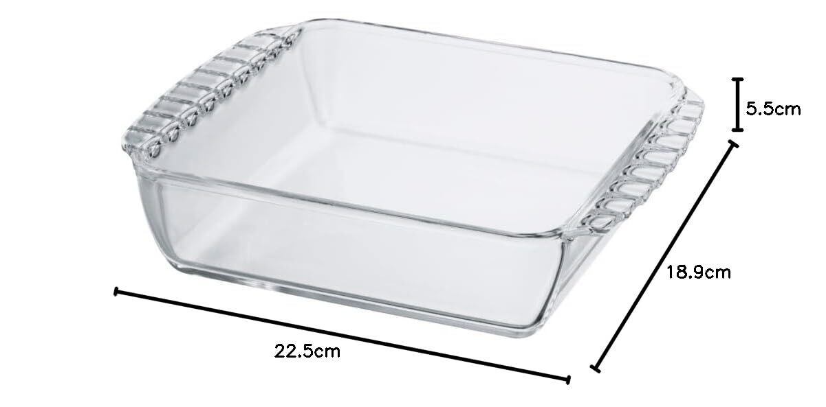 【商品詳細】本体サイズ:幅22.5×奥行18.9×高さ5.5cm、本体重量:790g、満水容量1300mL、本体材質:耐熱ガラス、日本製
