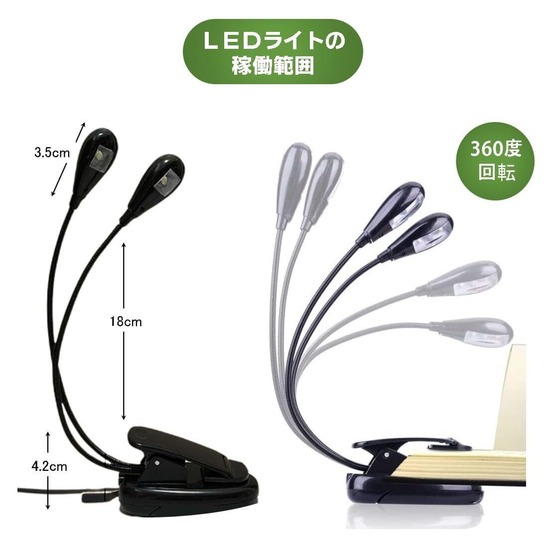 クリップ型 LEDスタンドライト LEDライト 譜面台 読書 乾電池式 360度回転 USBケーブル付き 高輝度 軽量