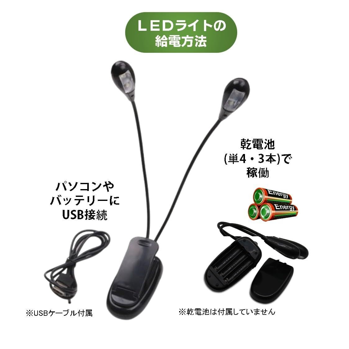 ■クリップ式LEDライトの特長 : 360度自由に角度調節が可能なグースネックタイプ、クリップ式で譜面台を始め、様々な所にワンタッチで脱着可能、2アームに高輝度白色LEDを2つ装備、電源はUSB接続の他に乾電池で使用可能(単4電池3個使用)。