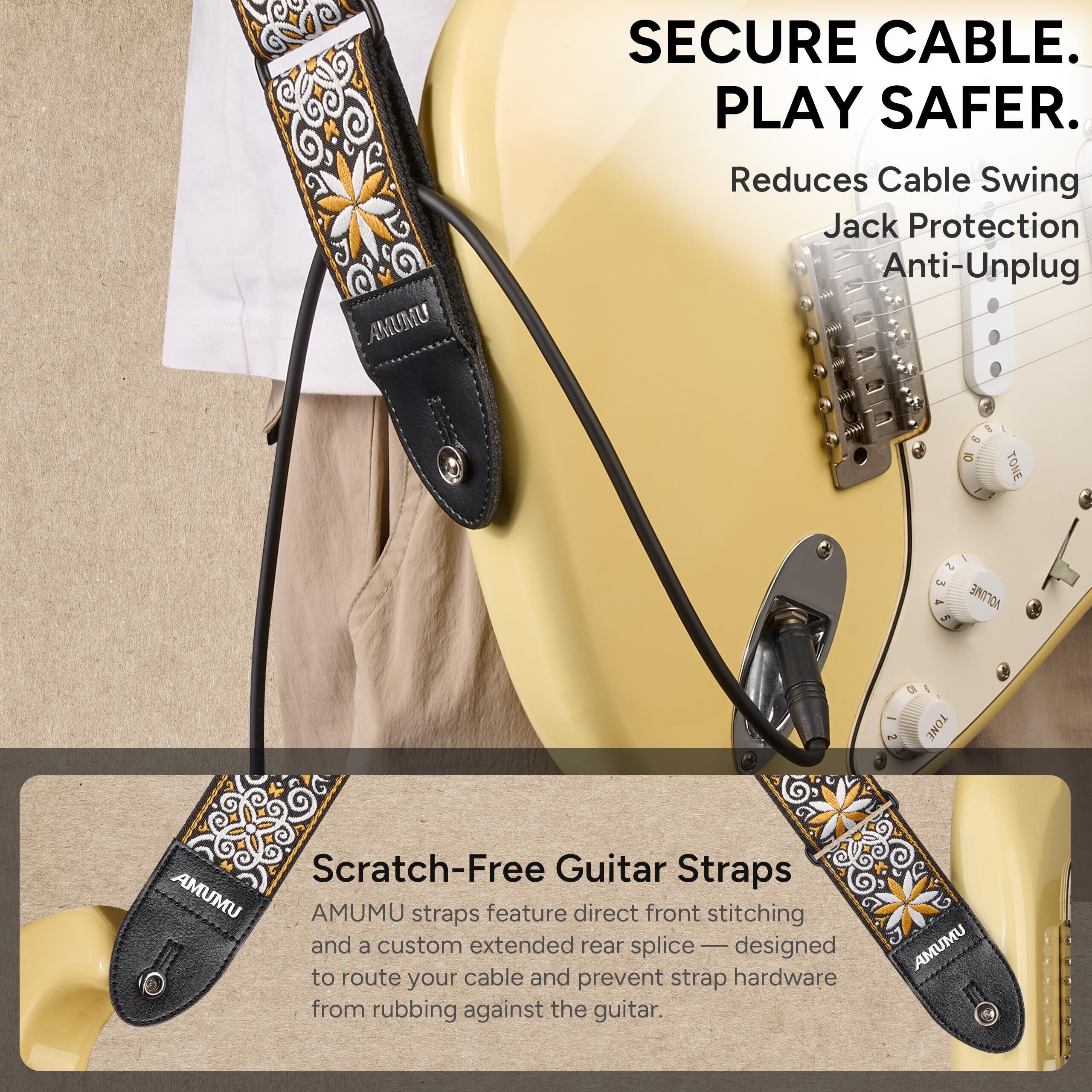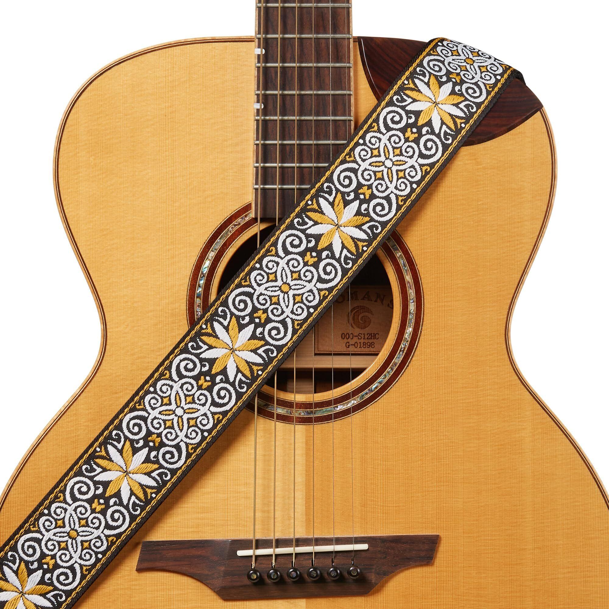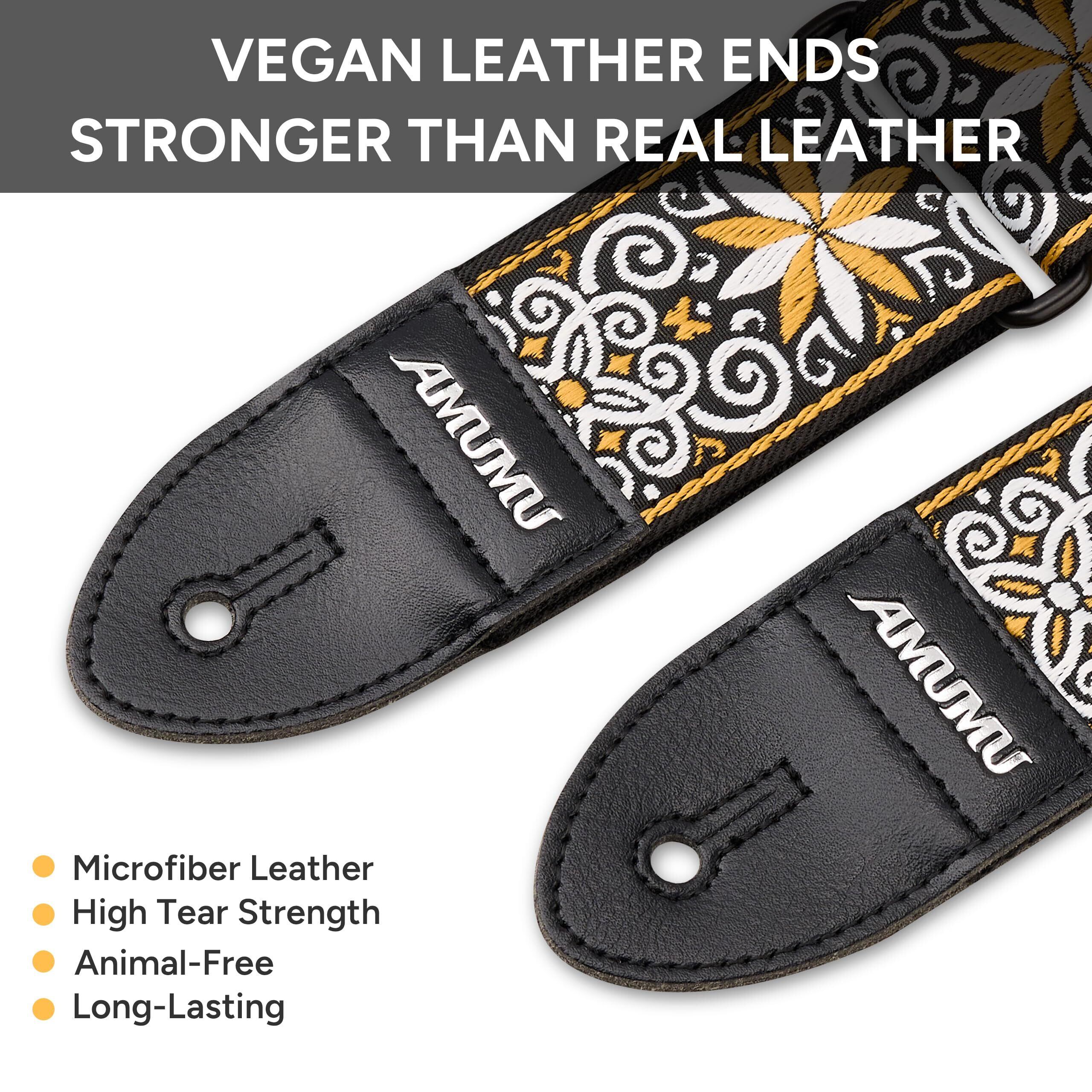 [Amumu] 5cm幅イエロー・フーテナニー刺繍ギターストラップ - プレミアムレザーエンド - アコースティック、エレクトリック、ベースギター、ウクレレ、マンドリン対応