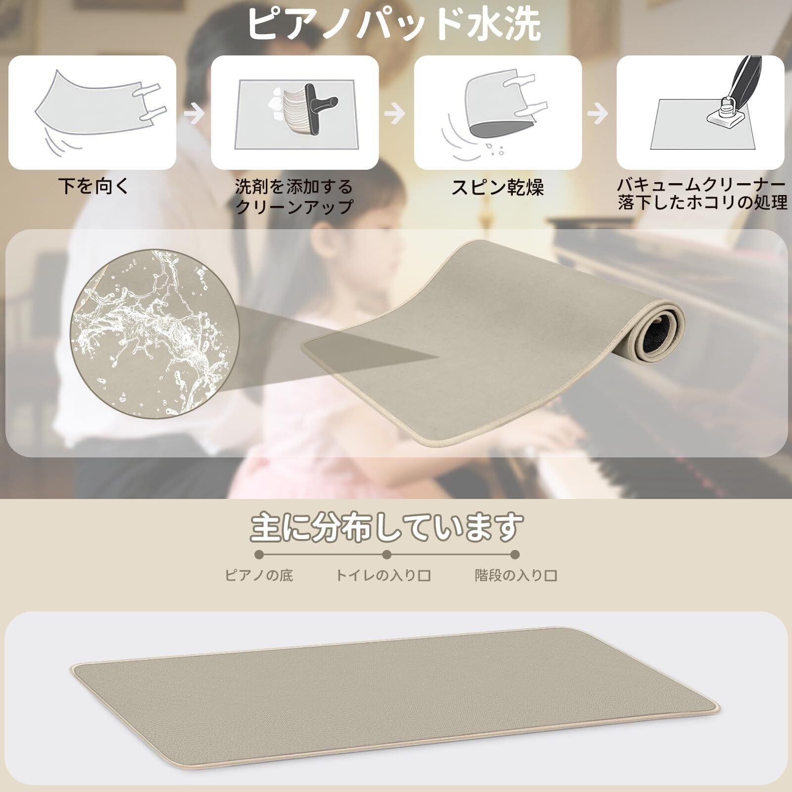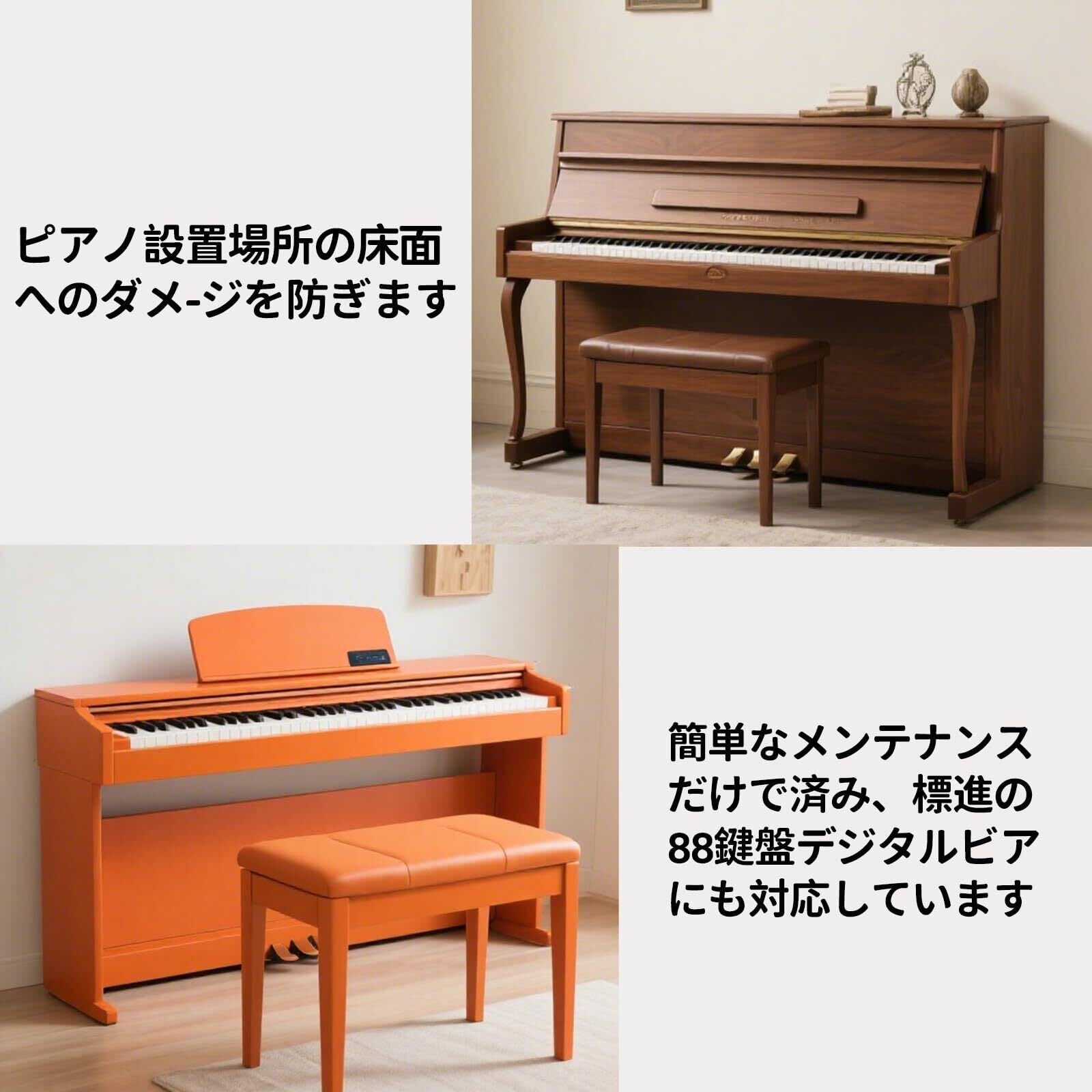 様々なタイプのピアノやフローリング、床タイル、カーペットなどの様々なタイプの床に適しています。床やピアノにぴったりとマッチします。※一部サイズが合わないピアノもございますので、ご購入の際にサイズをご確認ください。