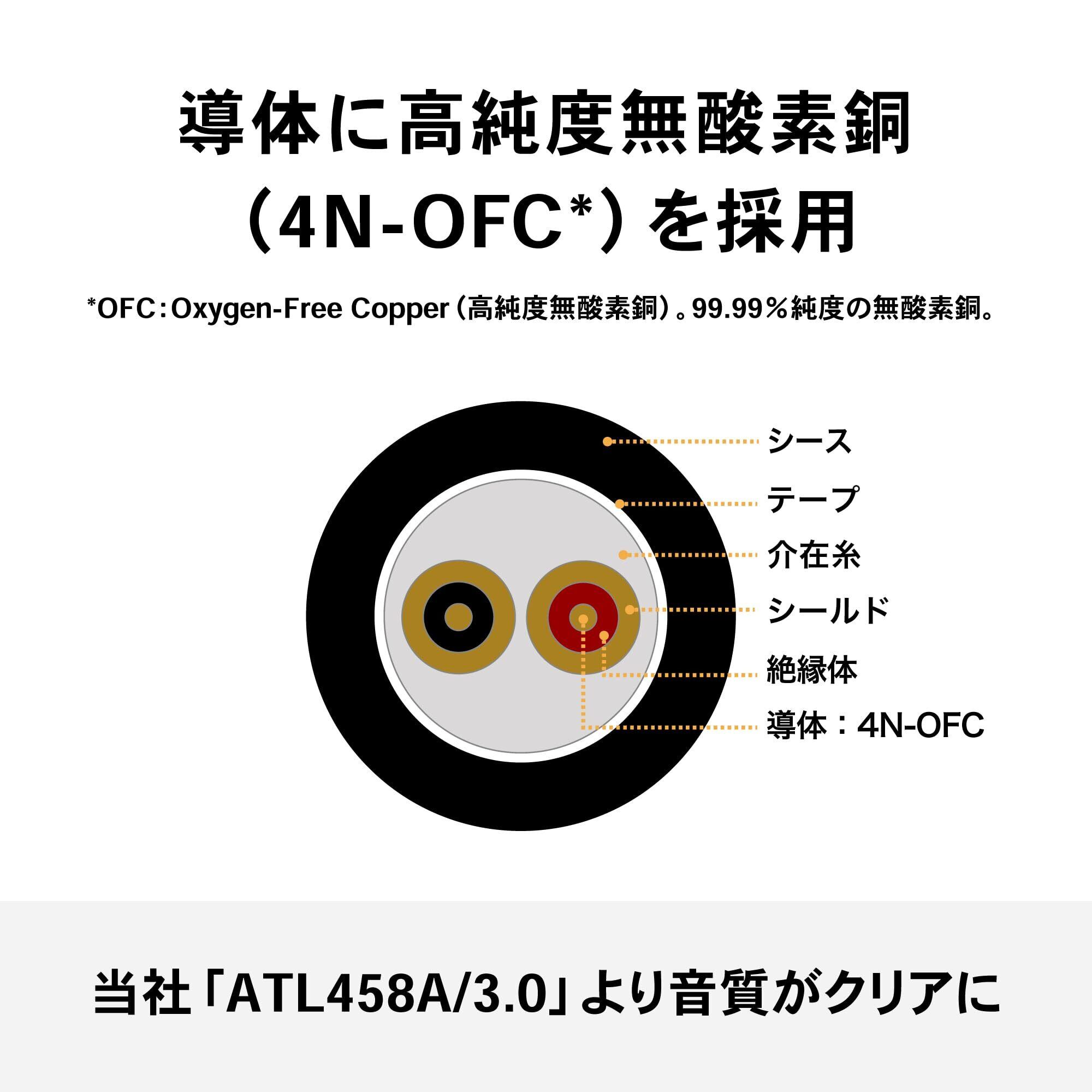 導体に⾼純度無酸素銅(4N-OFC*)を採⽤:⾳声信号を伝える導体には、導電性に優れた⾼純度無酸素銅(4N-OFC*)を採⽤。 マイクロホン本来の⾳をありのままに伝達します。 *OFC:Oxygen-Free Copper(⾼純度無酸素銅)99.99%純度の無酸素銅。