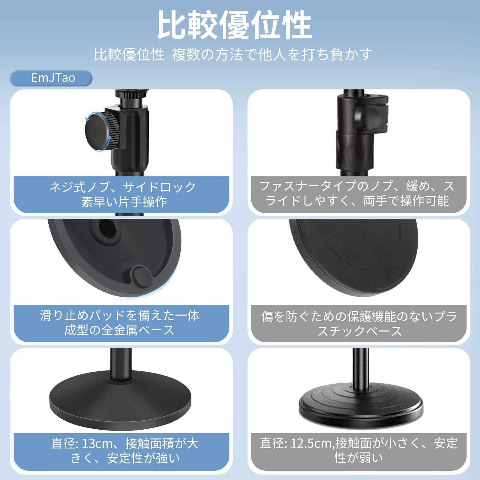 アップグレードされた安定したベース: 頑丈な金属素材を使用し、ベースの直径を大きくすることでマイクスタンドの重量は約600gに増加し、簡単に倒れることはありません。3つの滑り止めパッドが丸いベースの底に追加され、傷からあなたのテーブルを保護し、卓上マイクスタンドを移動するときにノイズを引き起こすことはありません