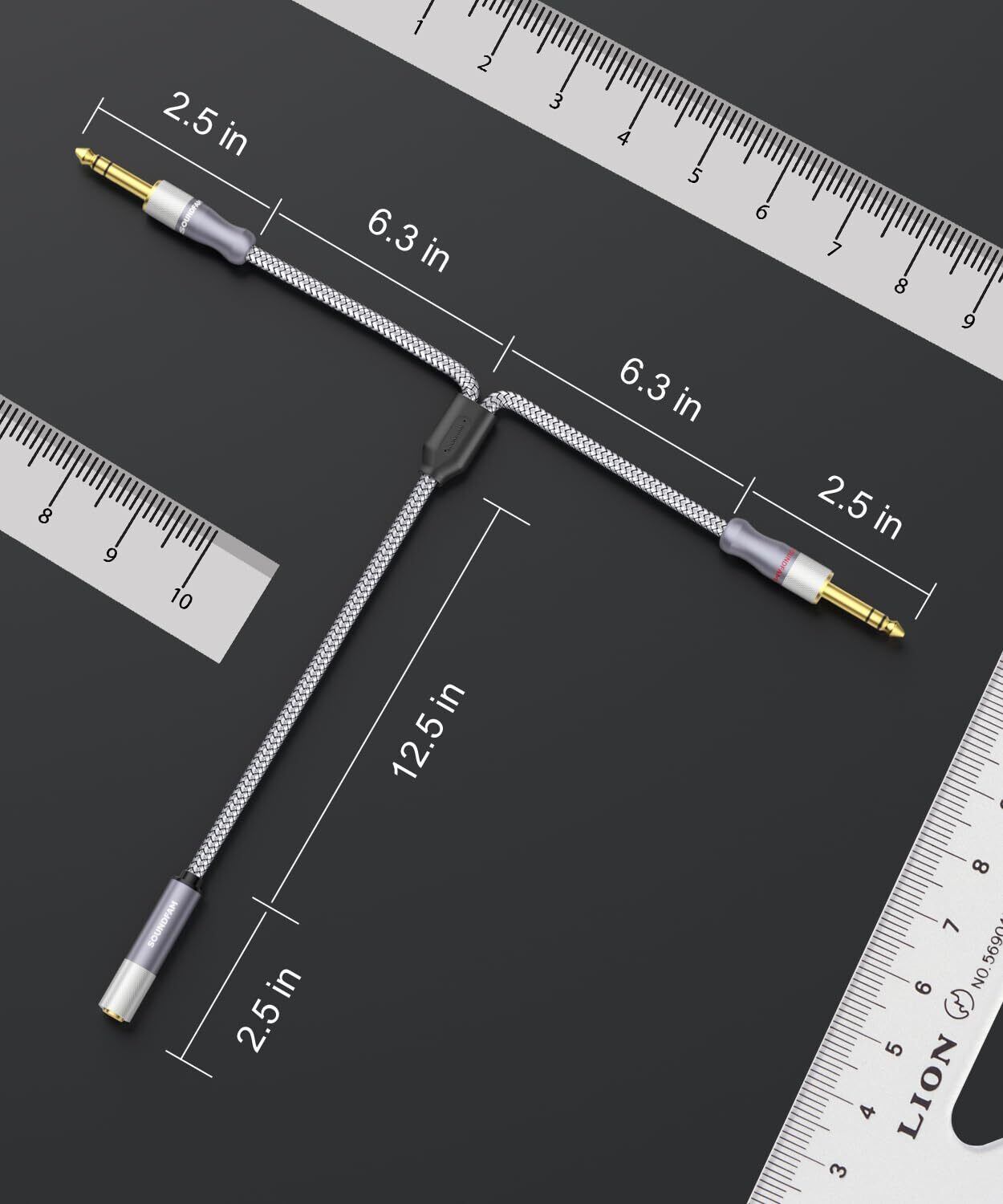 【ステレオからモノラルへの変換】この6.35mm Yスプリッターケーブルは、ステレオ(TRS)信号を2つのモノラル(TS)信号に効率的に分割、または2つのモノラル信号を単一のステレオ出力に結合します。ミキサー、アンプ、ギター、Hi-Fiシステムの接続に最適で、クリアで高忠実度のオーディオを維持します。