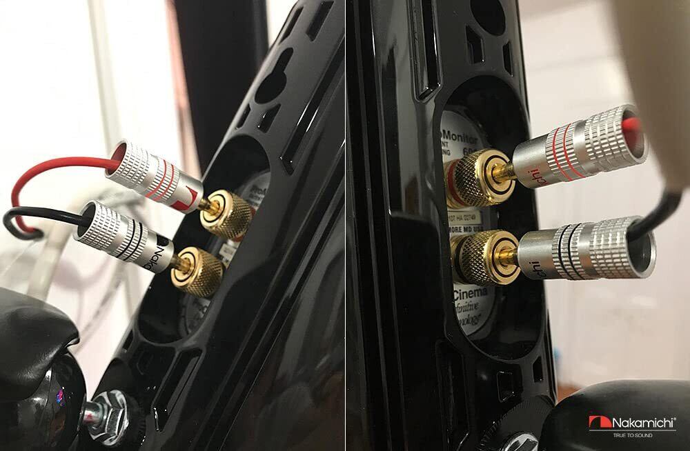 Nakamichiバナナプラグは、オーディオコンポーネントのバインディングポストにシームレスに直接フィットし、特にスペースが狭い場合に、スピーカーワイヤーをねじ込んだり緩めたりする手間を省きます。