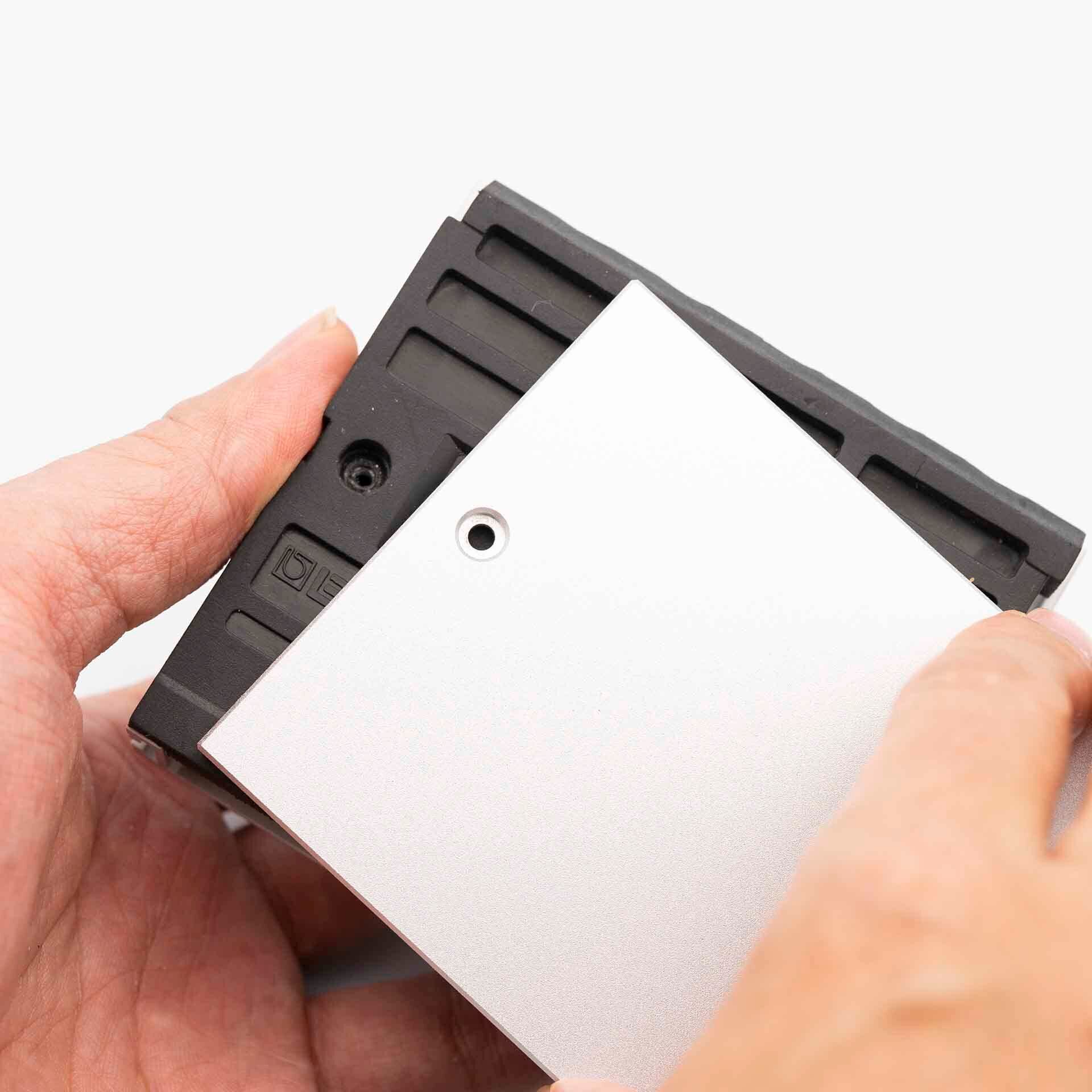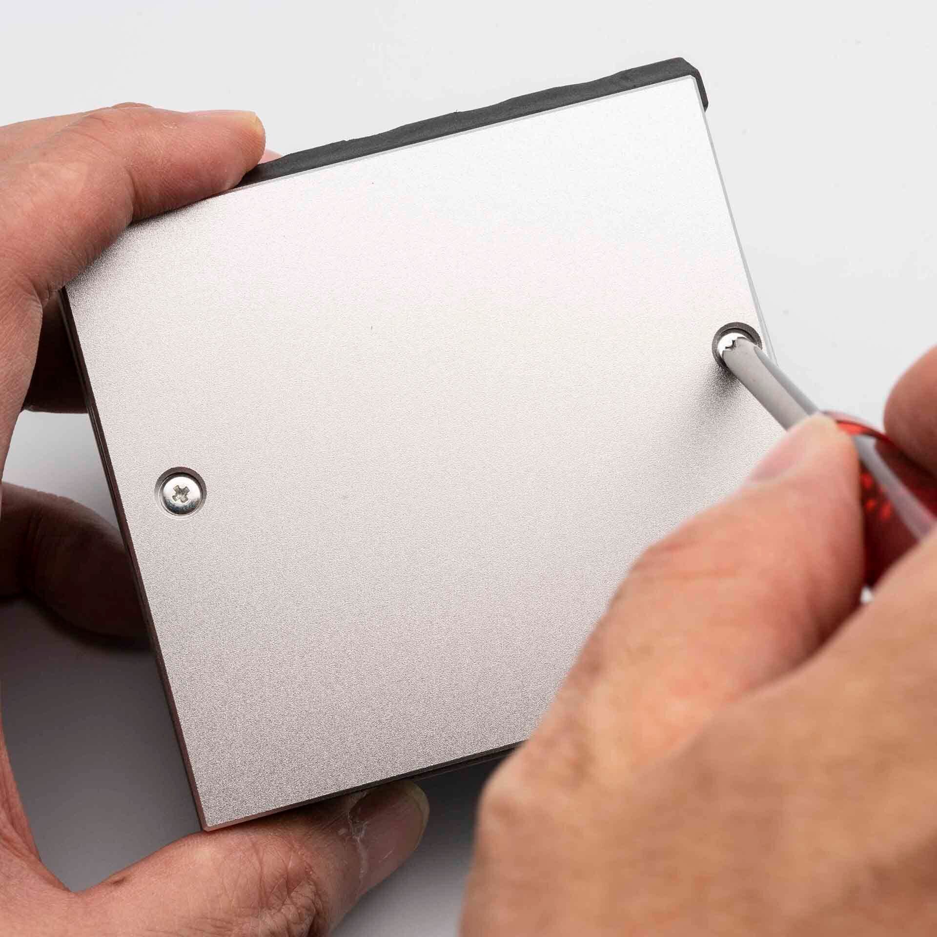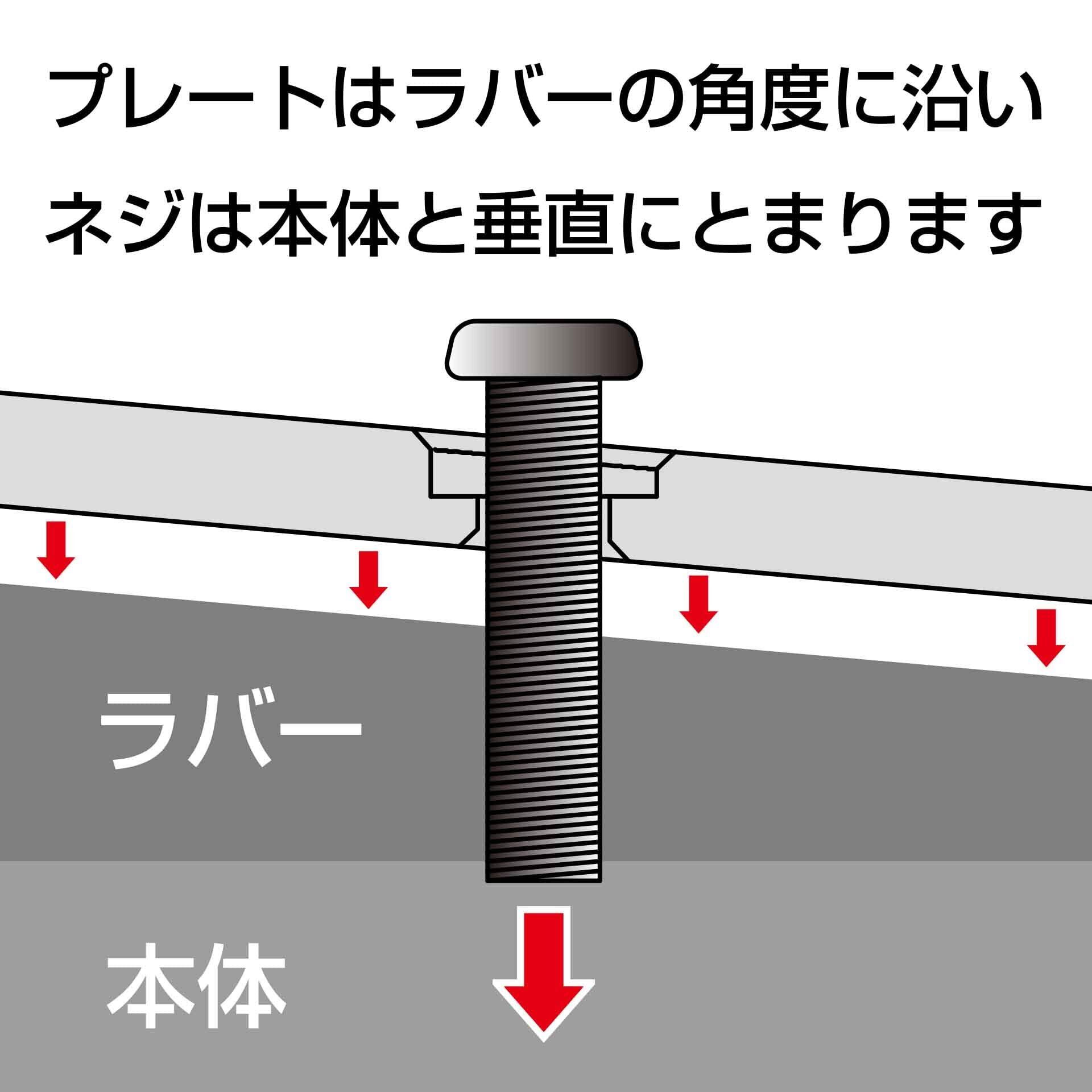装着は簡単で、元のネジを外し、本製品を底面に合わせて付属のネジで止めるだけです。プレートはラバーに沿って角度がつけられますが、ネジは本体金属部に垂直に止まるため、ズレが生じることはありません。