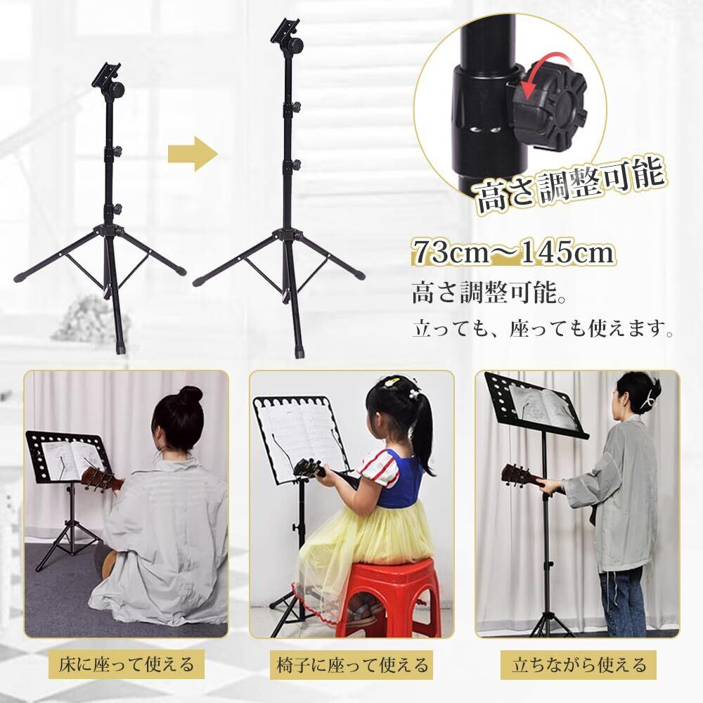 譜面台 折りたたみ式 楽譜たて 楽譜スタンド 73~145cm調節可能 楽譜クリップ付き 三脚 デスクトップスタンド ブックスタンド メニュースタンド 読書台 筆記台 縦置き 収納バッグ付き (ブラック二つ折り)