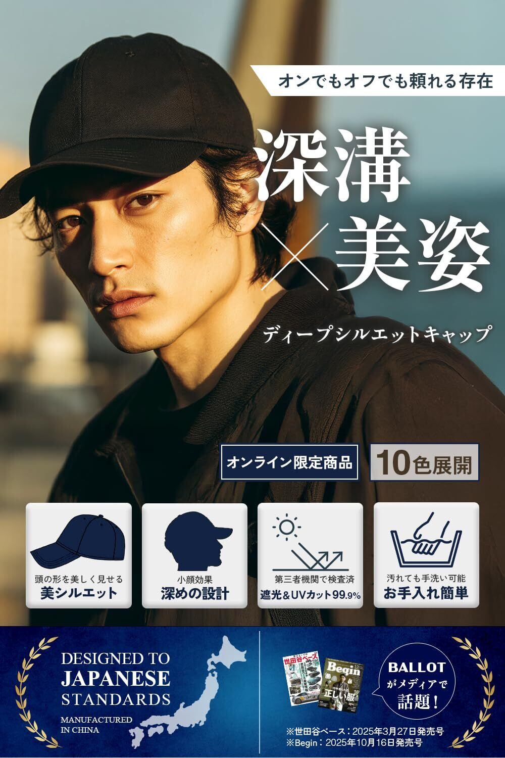 【計算された美シルエット】誰が被っても頭の形を美しく見せる、美しいシルエットを追求したコットンキャップです。無駄なロゴを一切排除したシンプルなデザインで、男女問わず幅広い年代にフィット。普段使いはもちろん、スポーツやアウトドア、旅行など様々なシーンで活躍します。おしゃれと機能性を兼ね備えた万能な帽子です。